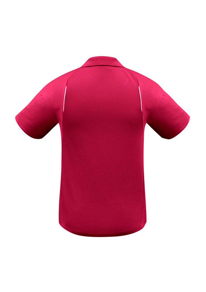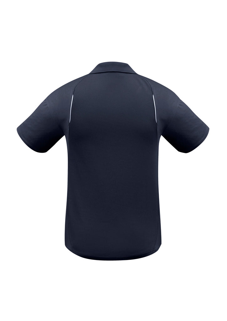 Mens polo shirt with contrast shoulder panels and piping and matching knitted collar made from 100% Breathable Polyester. New stretch sports interlock fabric with back and underarm mesh panel inserts for breathability.