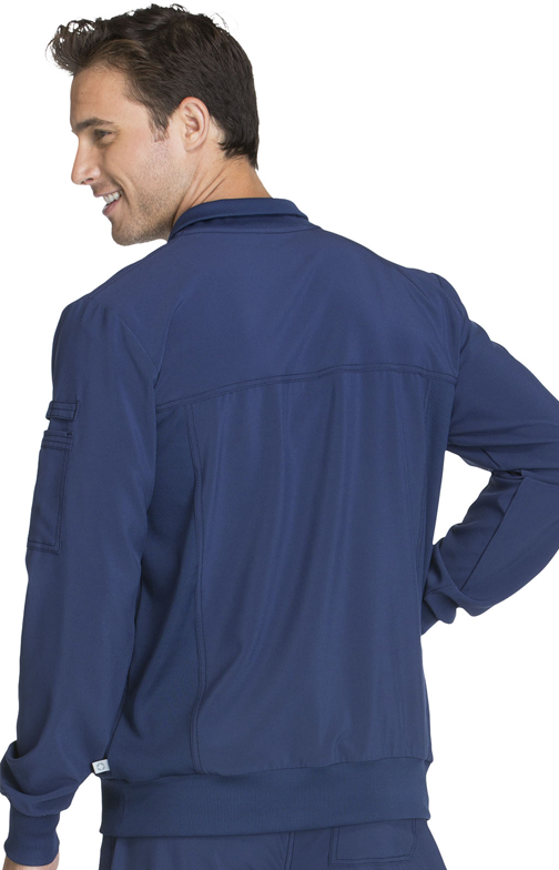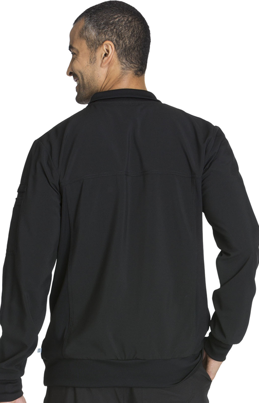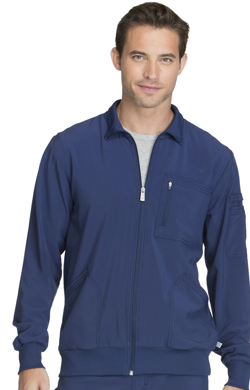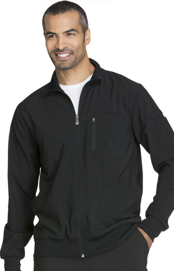 A Men's Athletic fit zip front jacket features back side panels, collar, cuffs and waistband made with a stretch rib knit for extra comfort. Also featured are a logo zipper pull, front chest pocket with security zip closure, patch pockets, and an instrument loop and sectional pocket on the left sleeve. Center back length: 28 . The comfortable stretch poplin fabric and super stretchy rib knit is the perfect combo for healthcare professionals.