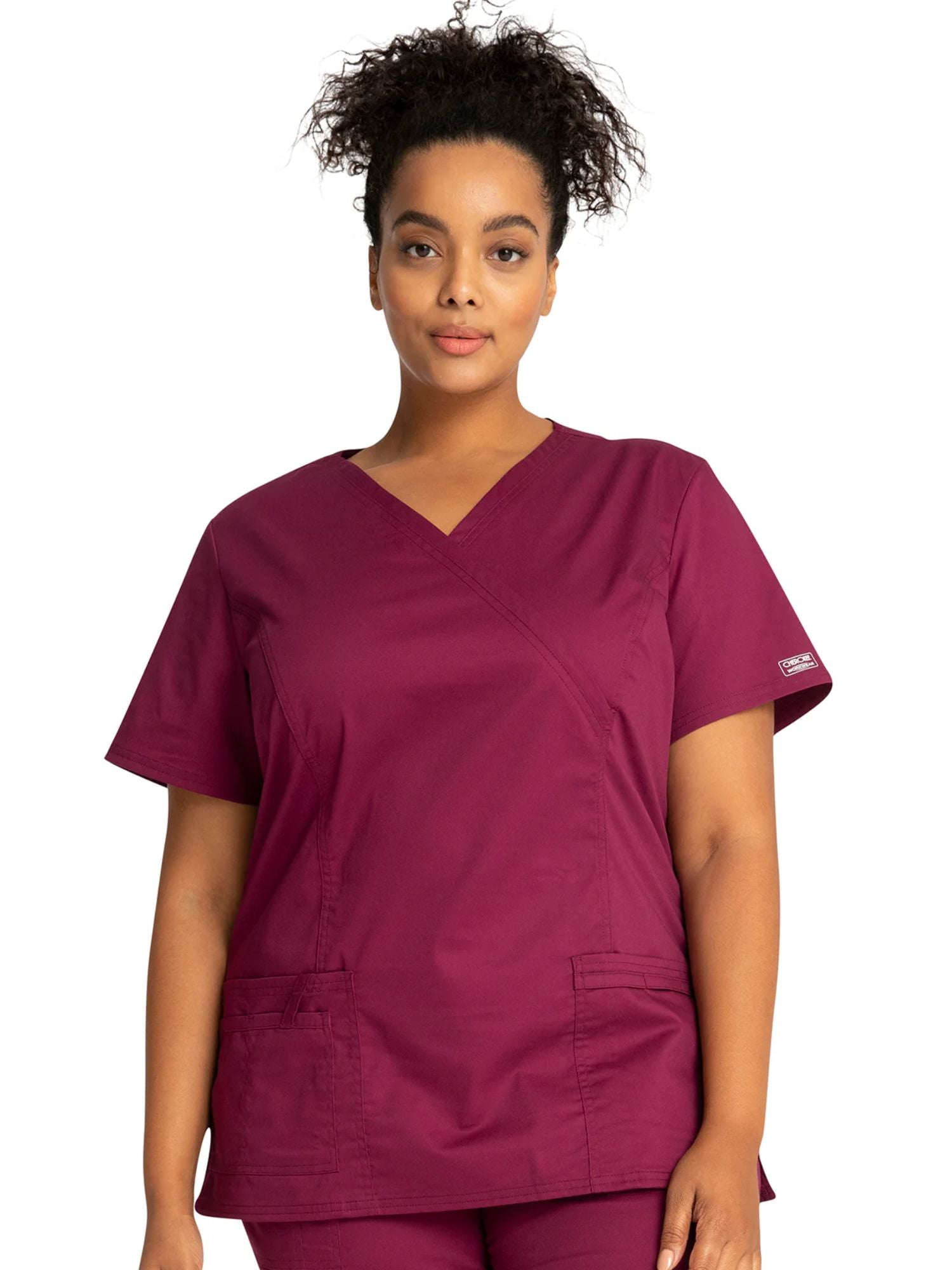 A mock wrap top features front princess seams and double needle topstitch detail. Also included are front patch pockets, a right side pocket with a sectional pocket and I.D. loop, and a left-side pocket with an instrument loop holder across the pocket. Back princess seams and side vents complete the picture. Centre back length: 27".
