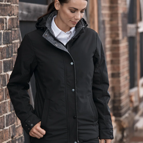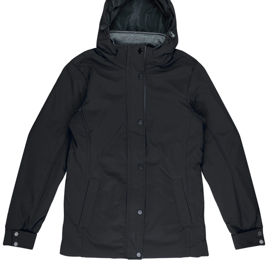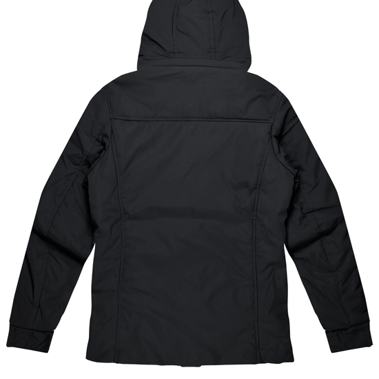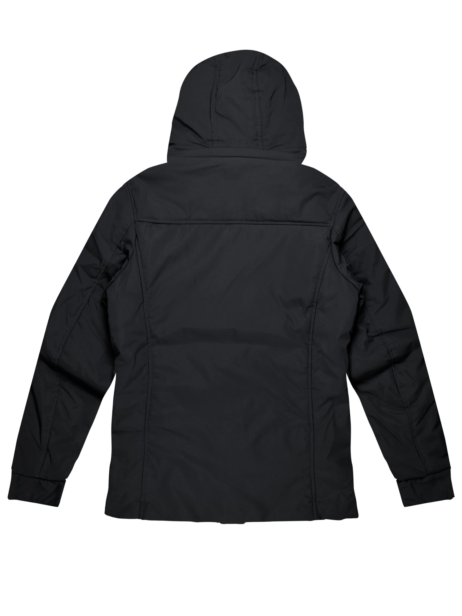 Fabric: Outer 135 gm 100% polyester satin finish. Inner 100% taffeta lining with polyester padding WP 5000 | BP 5000. Features: 2 side pockets with an internal pocket, a lightly padded detachable hood with a peak, extra body length with a twin-head main zipper, a contrast-printed tweed storm flap, adjustable cuffs, and internal zipper access for decoration.