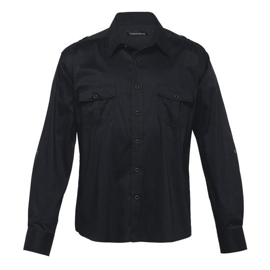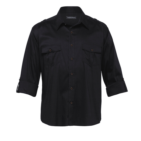 68% Cotton/, 30% Nylon/, 2% Elastane stretch fabric. Tapered fit shirt with fashionable collar/, metal look buttons and epaulettes on shoulders. Buttoned breast pockets and long sleeves adjustable to 3/4 sleeves with sleeve tab.