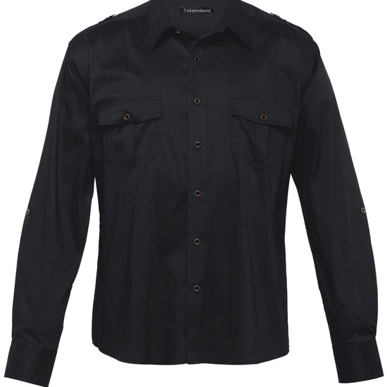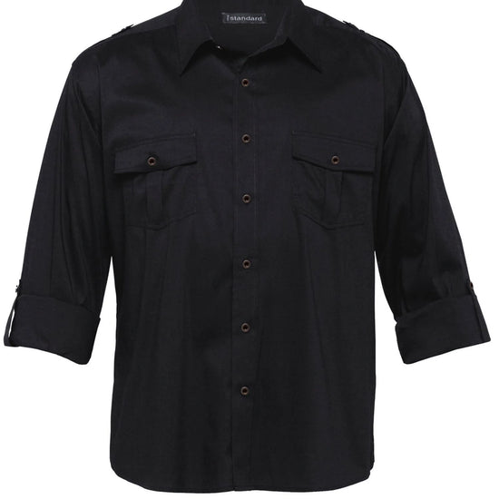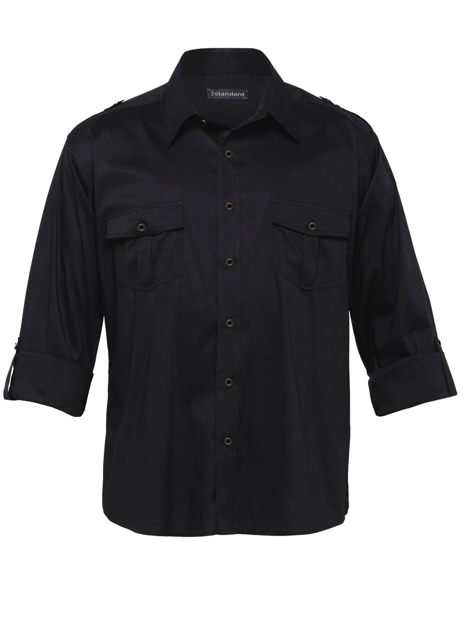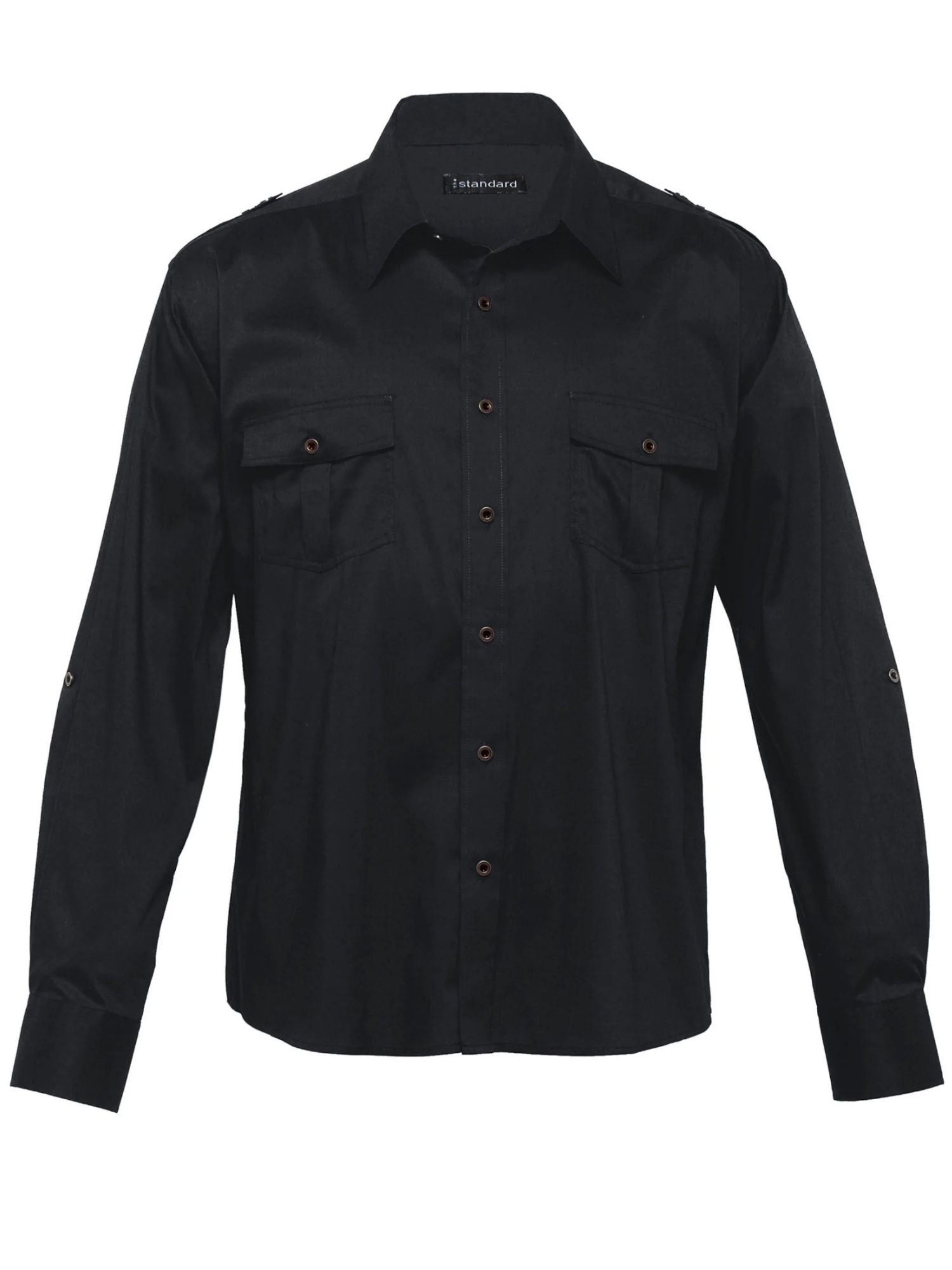68% Cotton, 30% Nylon, 2% Elastane stretch fabric. Tapered fit shirt with fashionable collar, metal-look buttons and epaulettes on shoulders. Buttoned breast pockets and long sleeves adjustable to 3/4 sleeves with sleeve tabs.