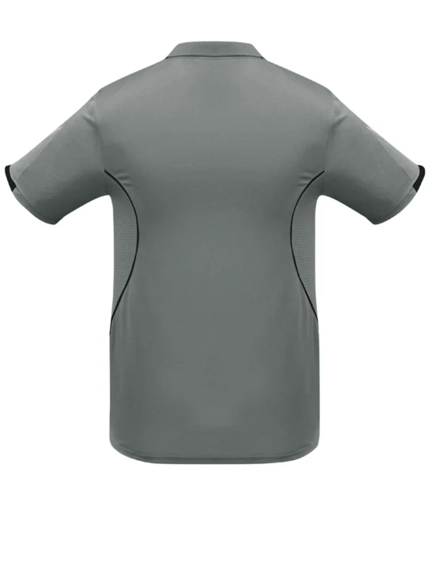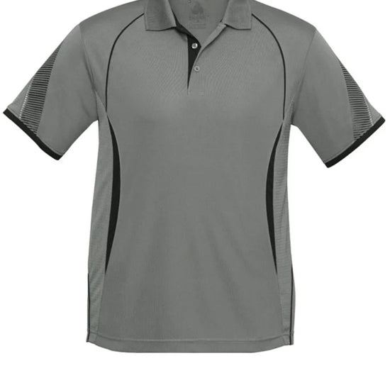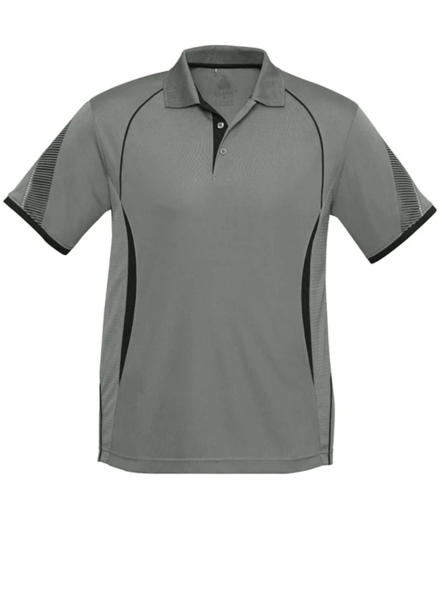 Men's Cool Sports Polo with contrast panels and piping. Features include 100% polyester sports interlock fabric with 155GSM and an excellent UPF rating, grid mesh underarm panels for breathability, a unique sleeve print feature, and a knitted collar with a contrast placket.