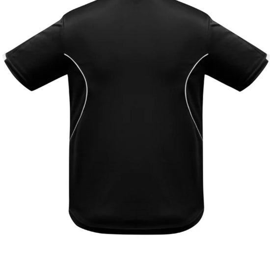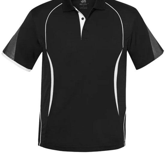 Men's Cool Sports Polo with contrast panels and piping. Features include 100% polyester sports interlock fabric with 155GSM and an excellent UPF rating, grid mesh underarm panels for breathability, a unique sleeve print feature, and a knitted collar with a contrast placket.