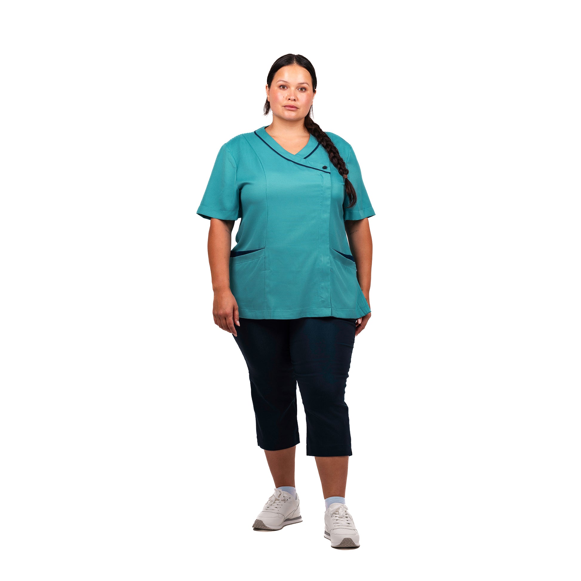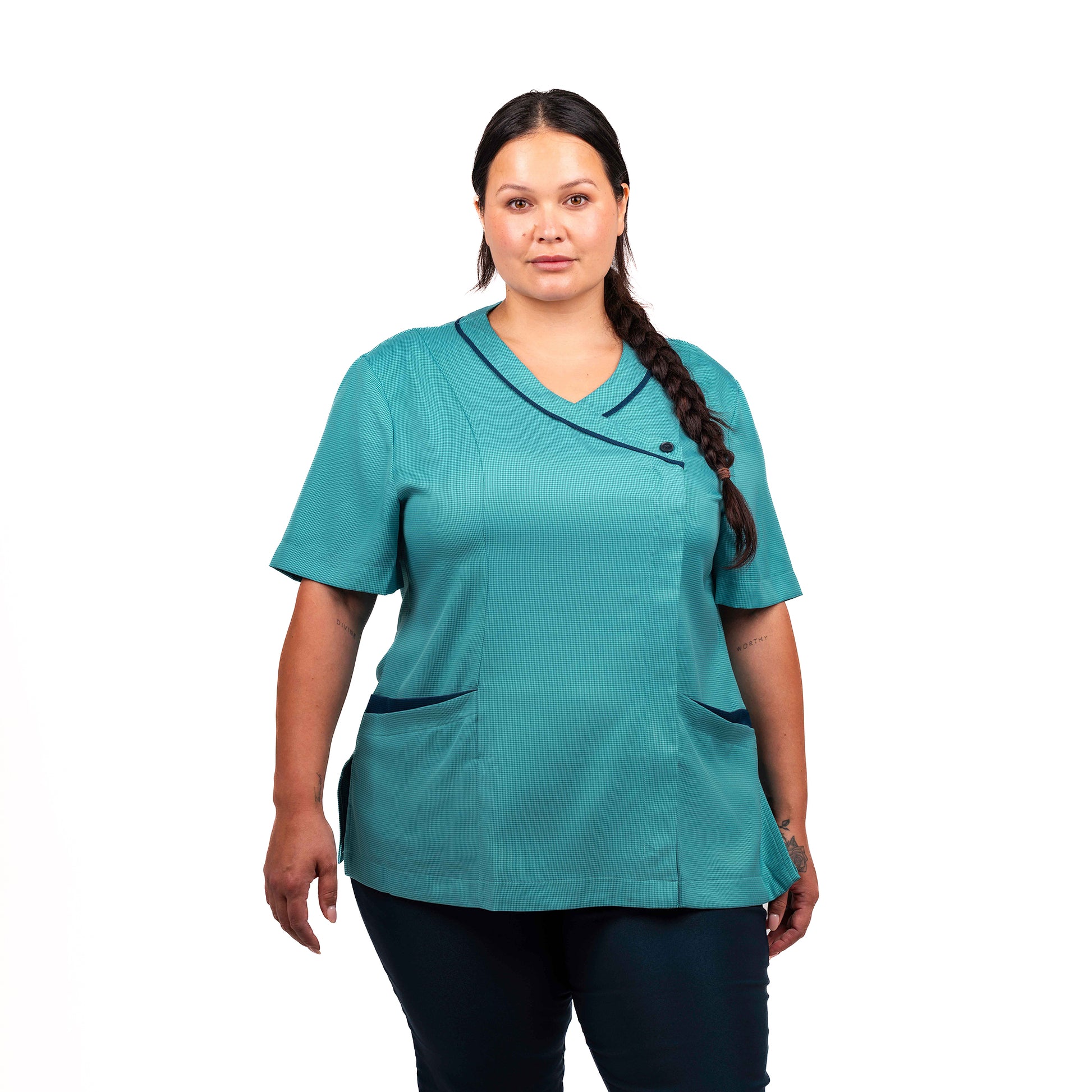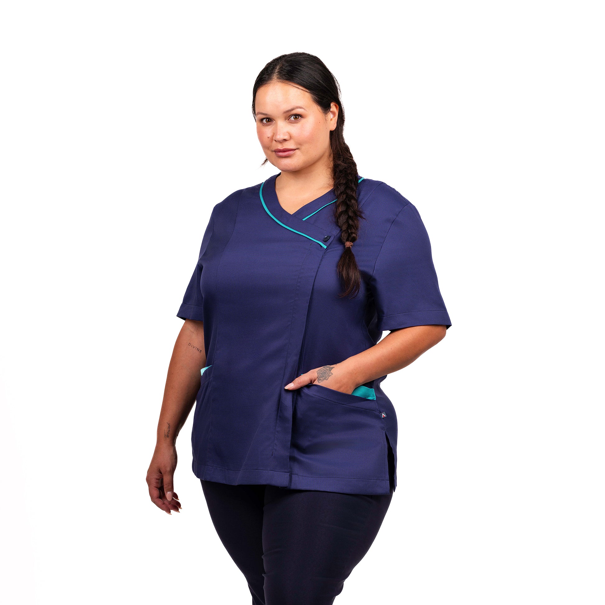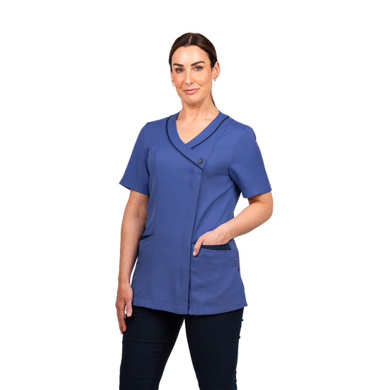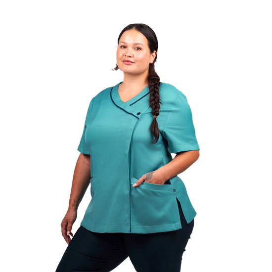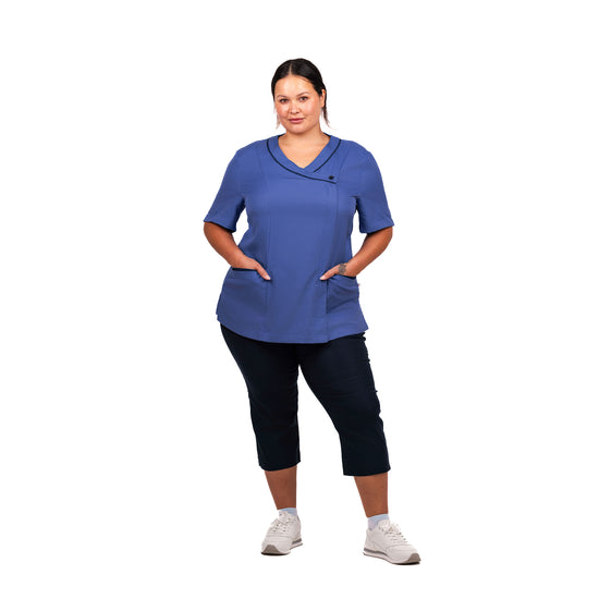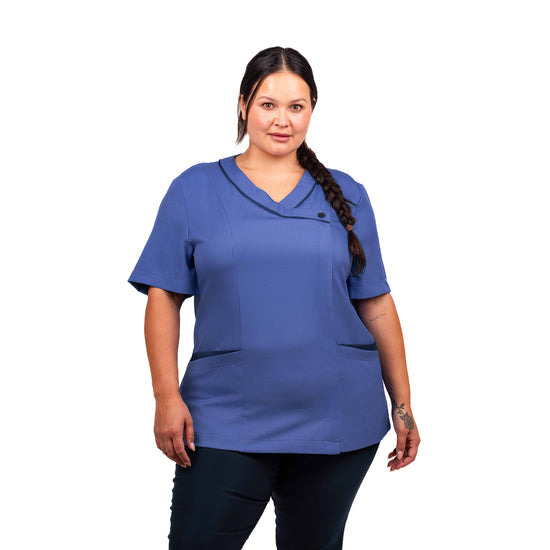 Our Rebecca Tunic is a crossover zip front style and button closer on both sides to avoid gaping. Providing plenty of storage with two deep hip pockets that have inner contrast pockets. Princess seam panelling and back shoulder pleats makes for a great fit.