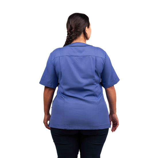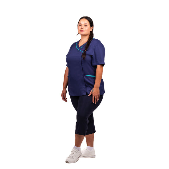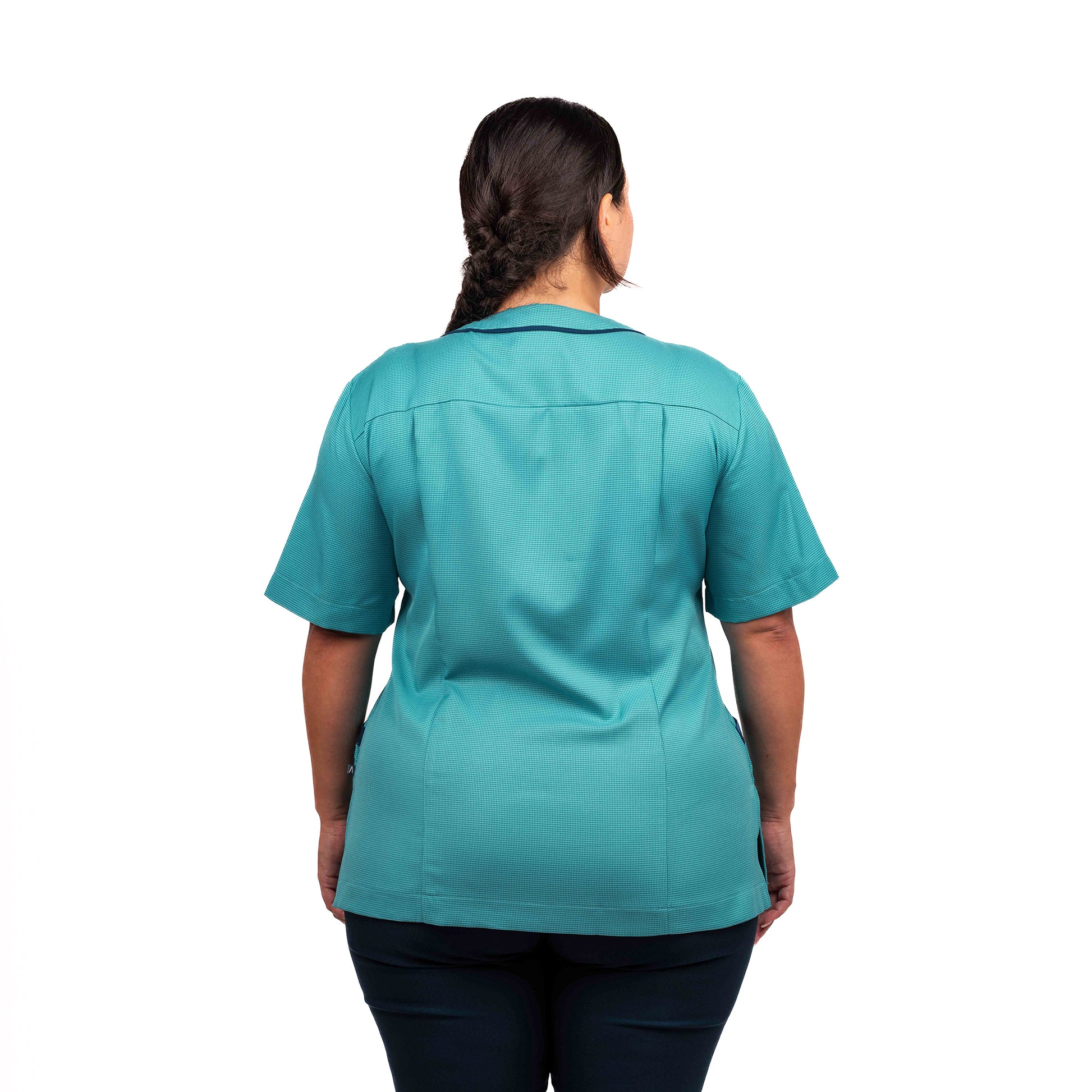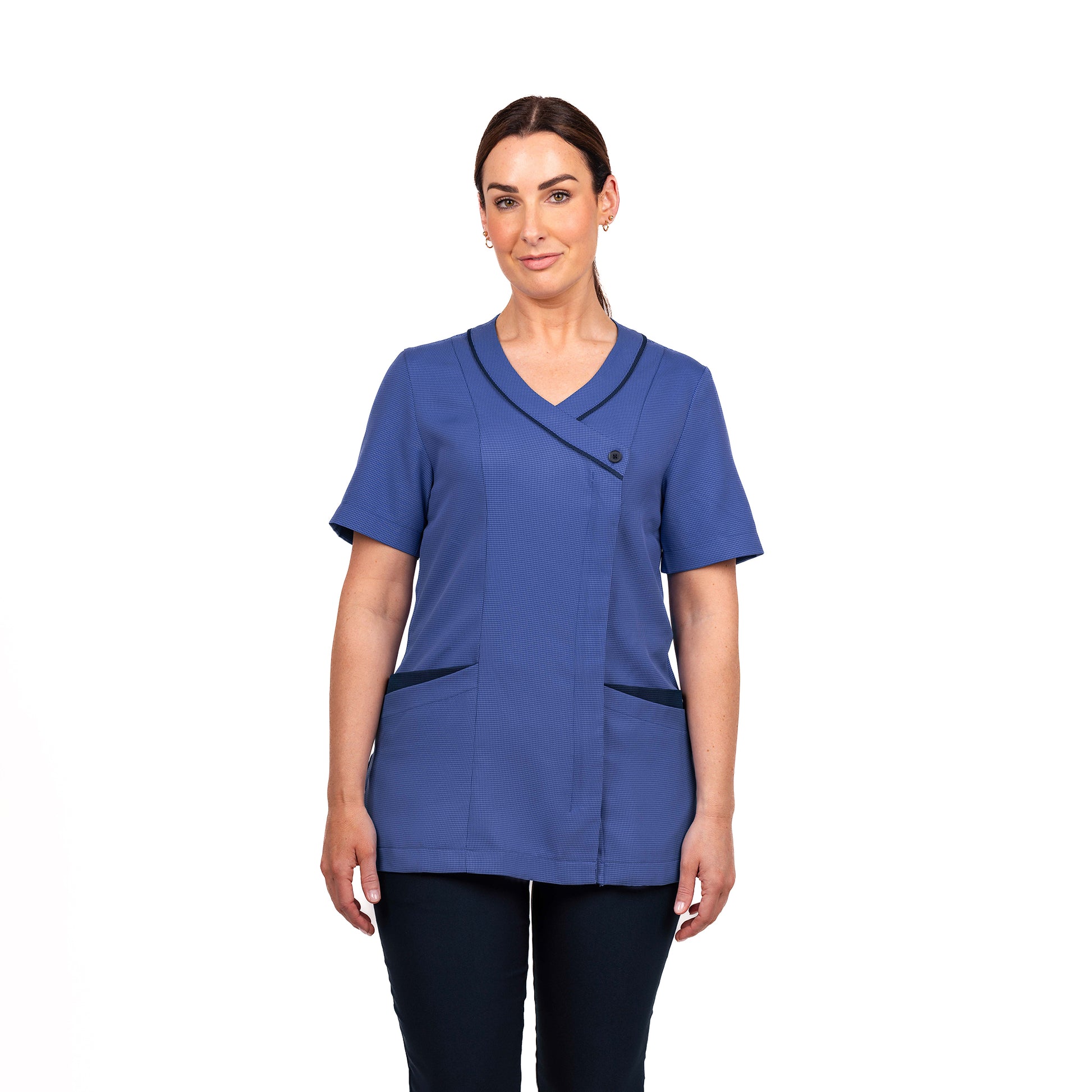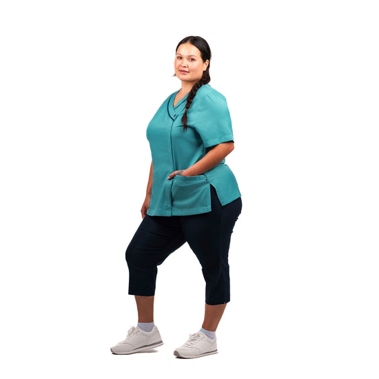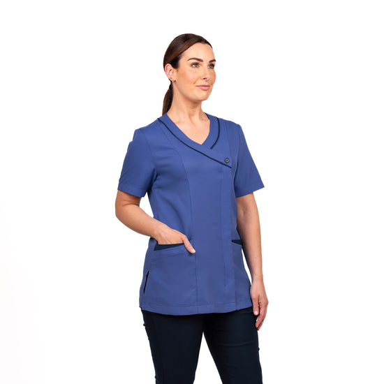 Our Rebecca Tunic is a crossover zip front style and button closer on both sides to avoid gaping. Providing plenty of storage with two deep hip pockets that have inner contrast pockets. Princess seam panelling and back shoulder pleats makes for a great fit.
