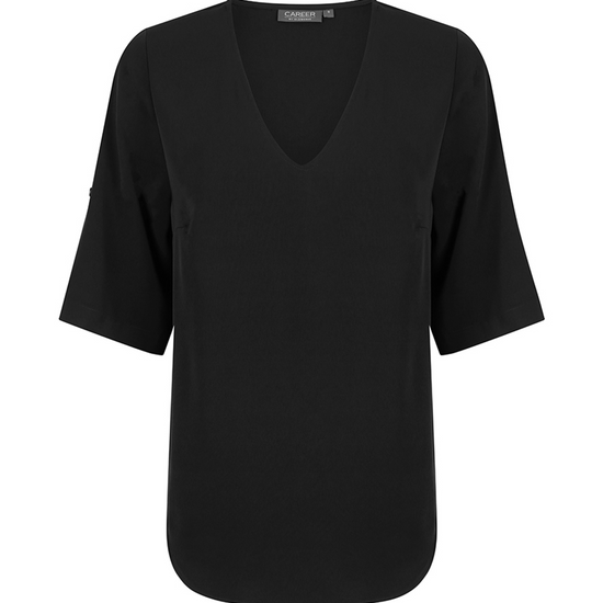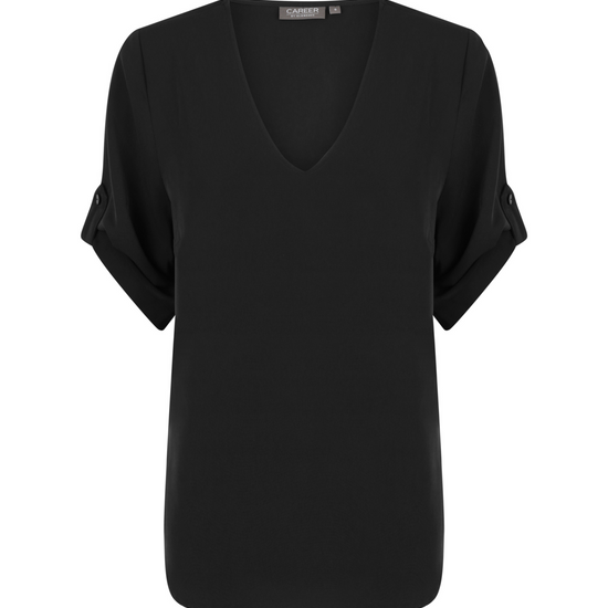 The Reese short sleeve V-neck top is fabricated in a luxe twill fabric that is durable, lightweight and easy to look after. It features elbow length sleeve with a tab and button to roll up to add an extra design detail. This could be a staple top in your weekly work wardrobe, is comfortable and works with you and making you and your team look polished and professional.