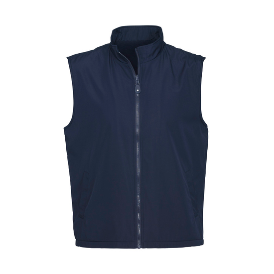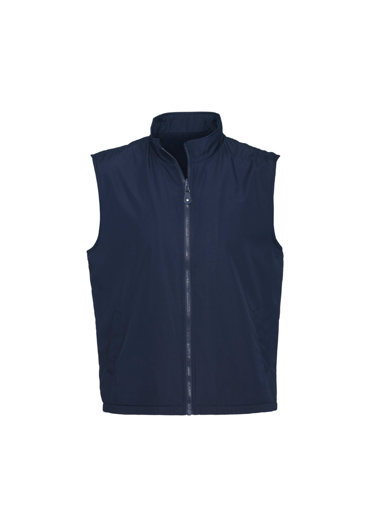 Reversible Unisex Vest with two open side welt pockets/, full front zipper with a leather puller and an adjustable drawstring around the hem. Zipper acces for embroidery. Made from100% Polyester on the outer/, and 100% Polyester panel with 100% Microfleece on the inner.