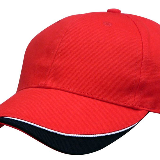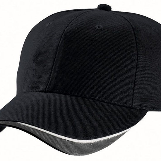 Heavy brushed cotton cap with velcro touch fastener. Contrast colour detail and piping on the front of one side of the brim.