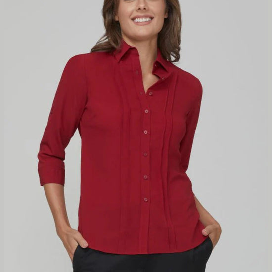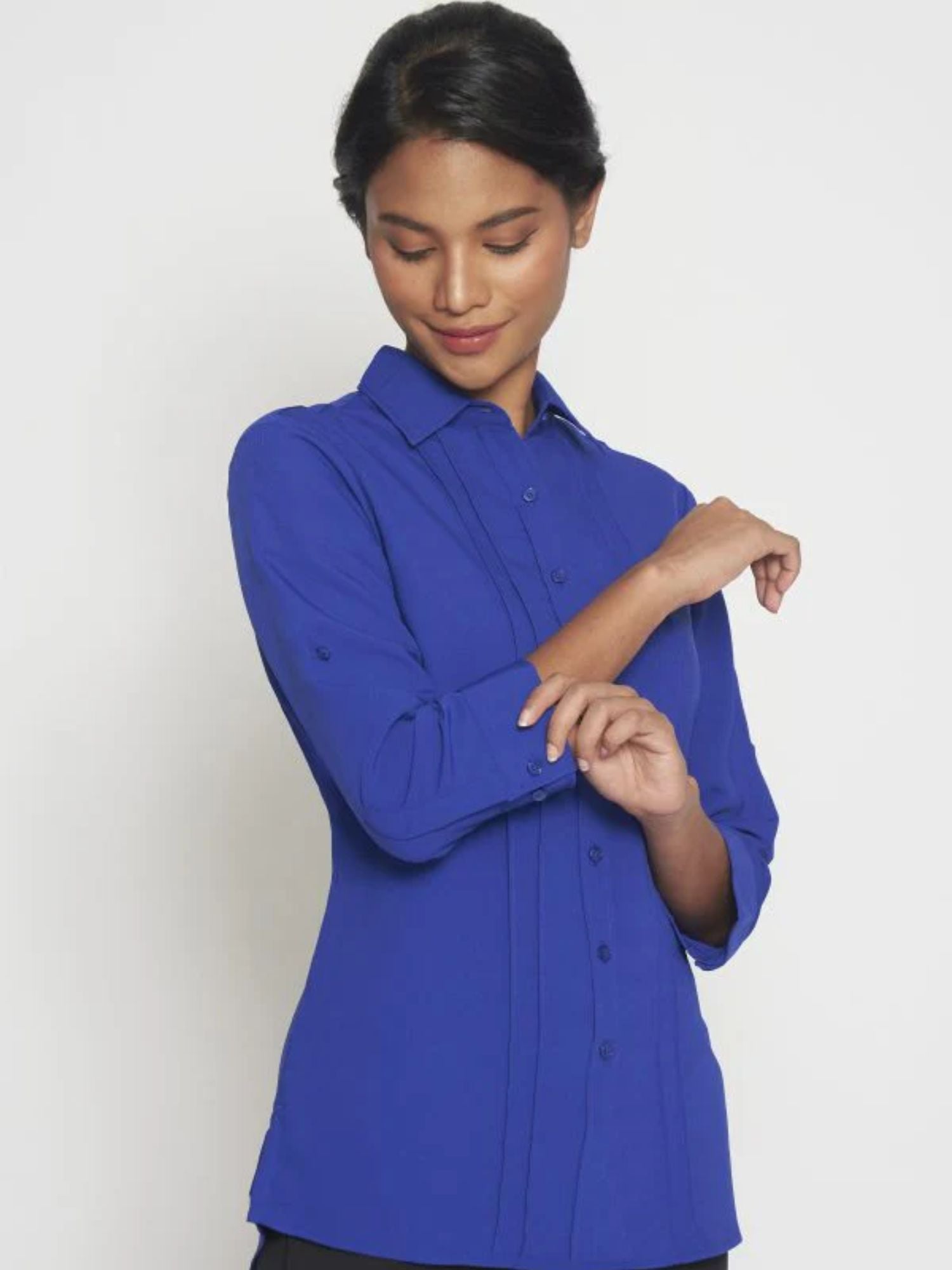 The Sophia blouse has a fine pintuck detail at the front that looks great alone or with a knit cardigan or blazer. With a natural stretch, action tucks, side splits and a 3/4 sleeve that can be rolled up and buttoned.