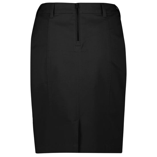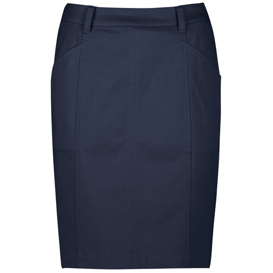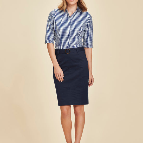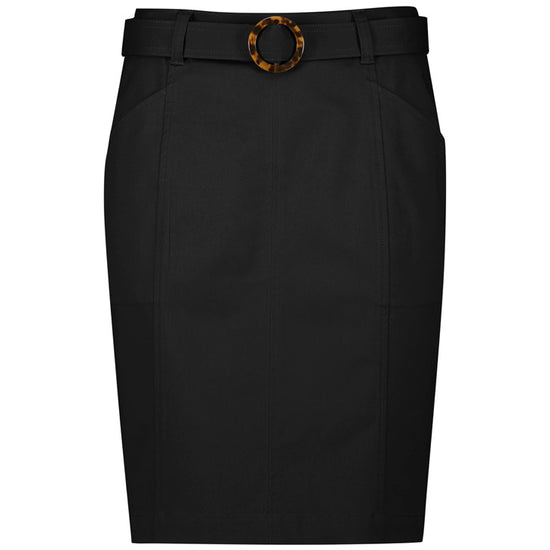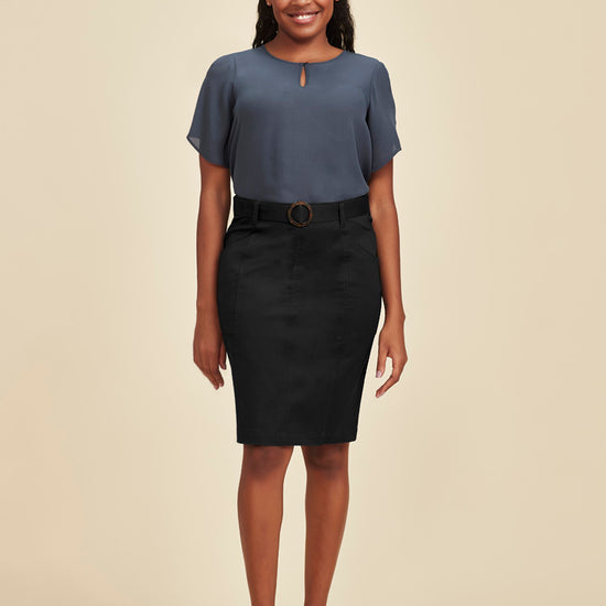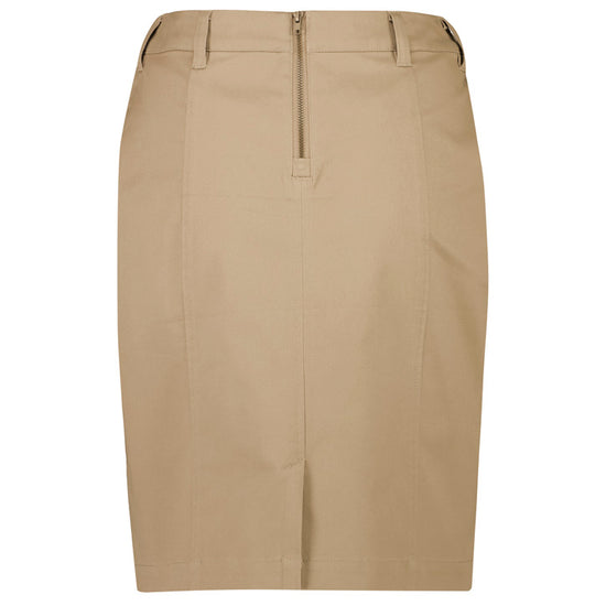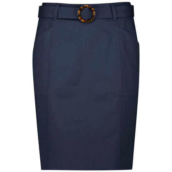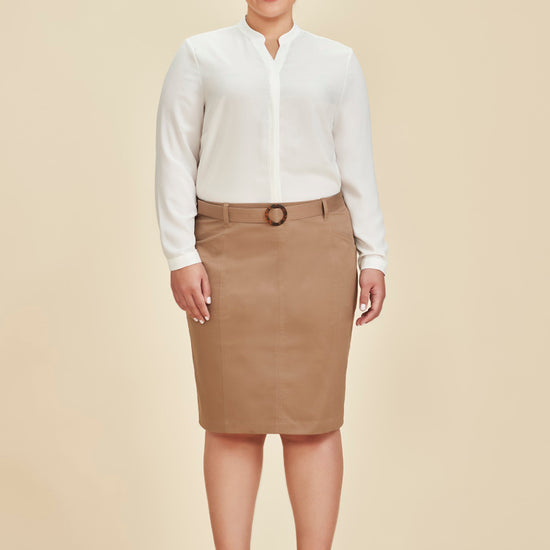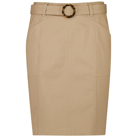 A modern Chino skirt featuring functional back split, non-gaping side seam pockets, metallic back zip feature, belt loops and modern trims. Pencil shape designed to finish mid length, but will vary depending on wearers height. Detachable belt included. Fabric has added stretch for comfort and easy movement.