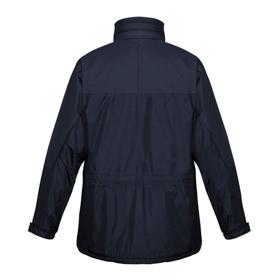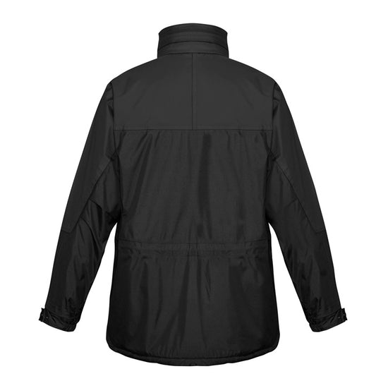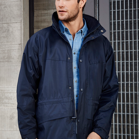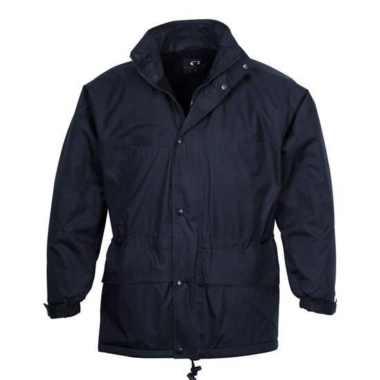 Winterweight unisex jacket with covered zip front and drawstring waist. High wind collar with concealed seam sealed hood. Two way large front pockets/, access from the side or the front. 100% Polyester outer with heat sealed seams is waterproof and Microfleece lining for extra warmth.