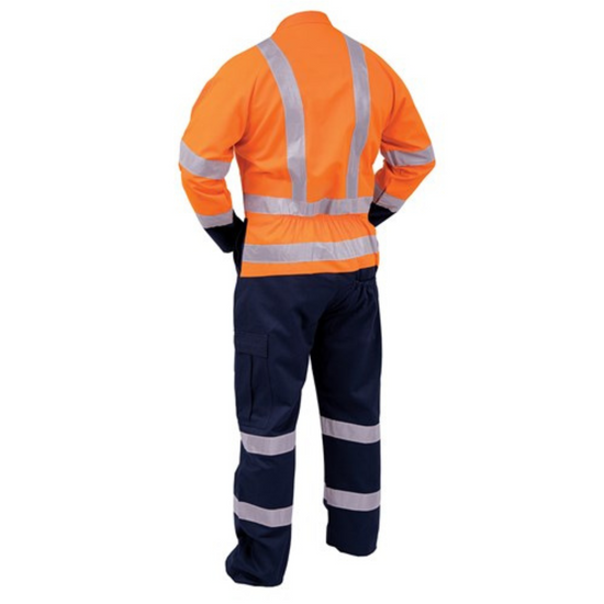 Two tone front overall with reflective tape and elastic back for comfort. Extra long contrast back with reflective tape. Design complies with AS/NZS 4602.1999 day and night wear. Orange complies to TTMC.