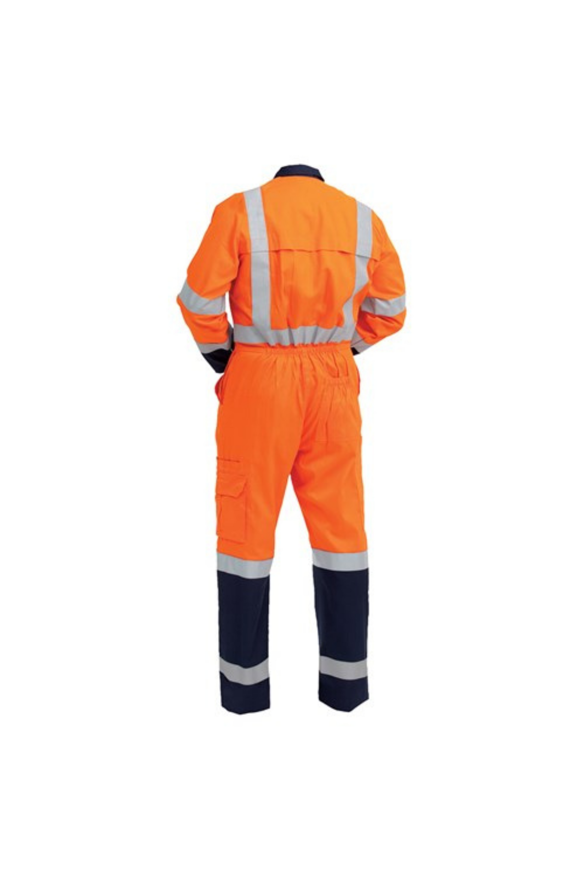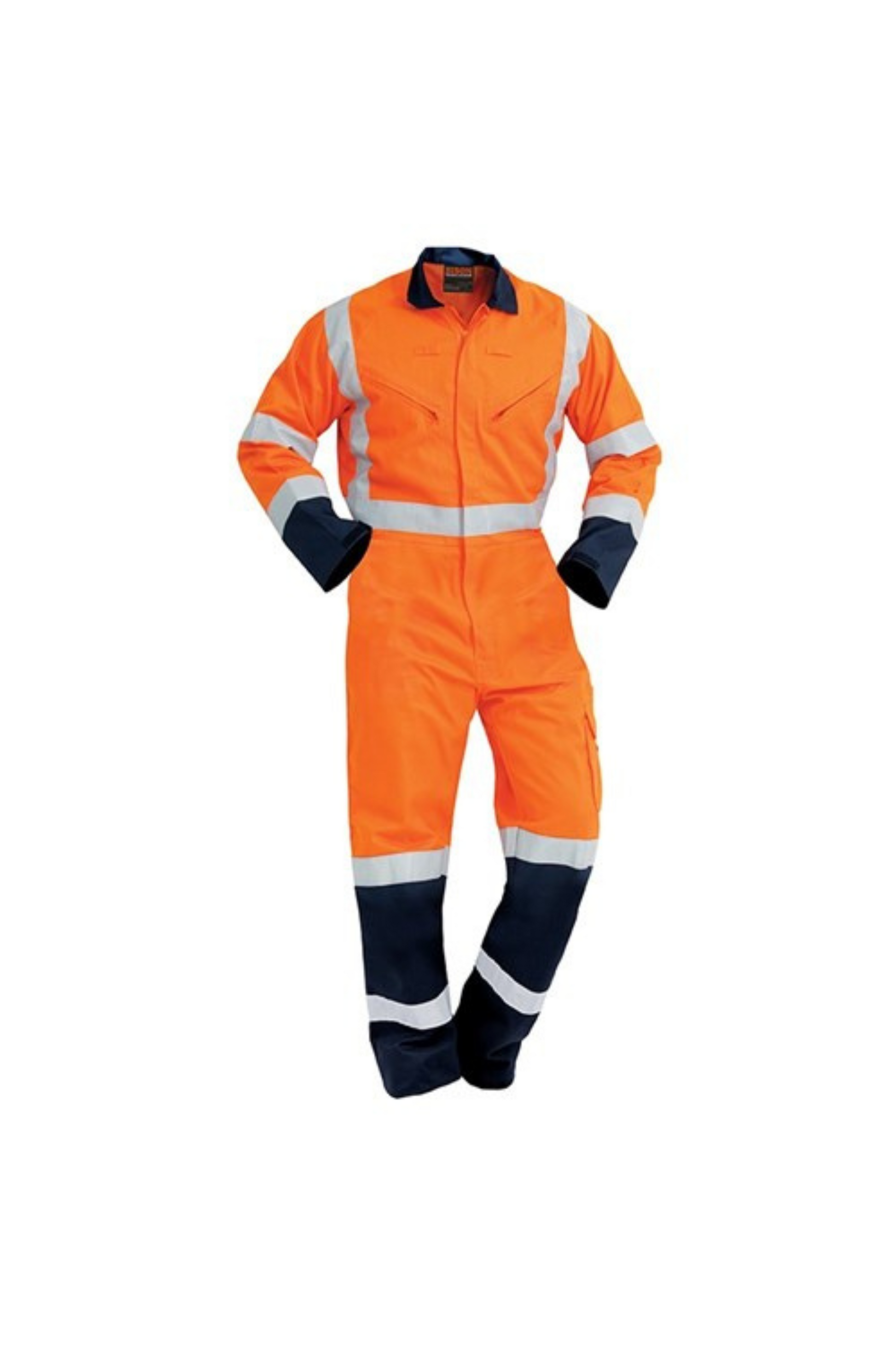 Two tone front overall with reflective tape and elastic back for comfort. Lightweight/, breathable and fatigue free! 38% lighter than your premium weight overall. Extra long contrast back with reflective tape. Design complies with AS/NZS 4602.1999 day and night wear. Orange complies to TTMC.