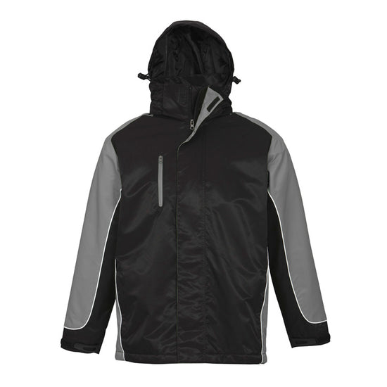 Unisex style jacket with concealed hood and two way front zipper with storm flap. Front right side chest pocket with MP3 access. Contrast colour trim sleeve and side panels. PU Coated 100% Nylon outer with Microfleece lined body for warmth and Polyester lined sleeves for less bulk.