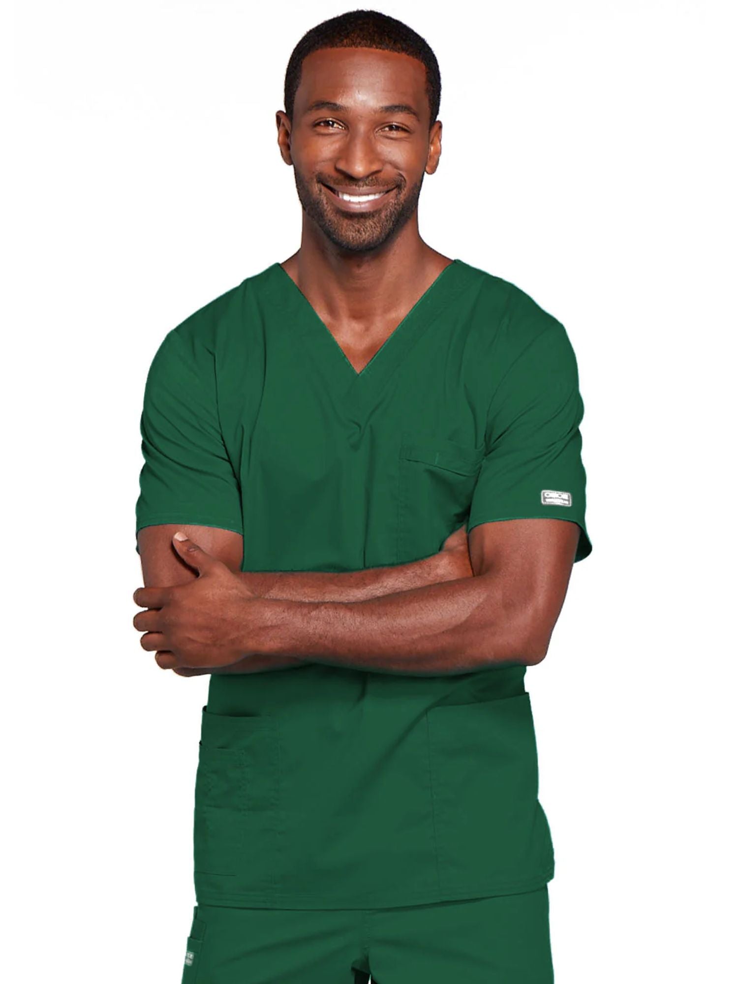 A Unisex V-neck features double needle stitching. The chest pocket features an instrument holder. Also included are two patch pockets, an additional instrument/cell phone pocket on right side, back yoke and side vents. Center back length: 28" Bi-Stretch, Durable, Extra Soft