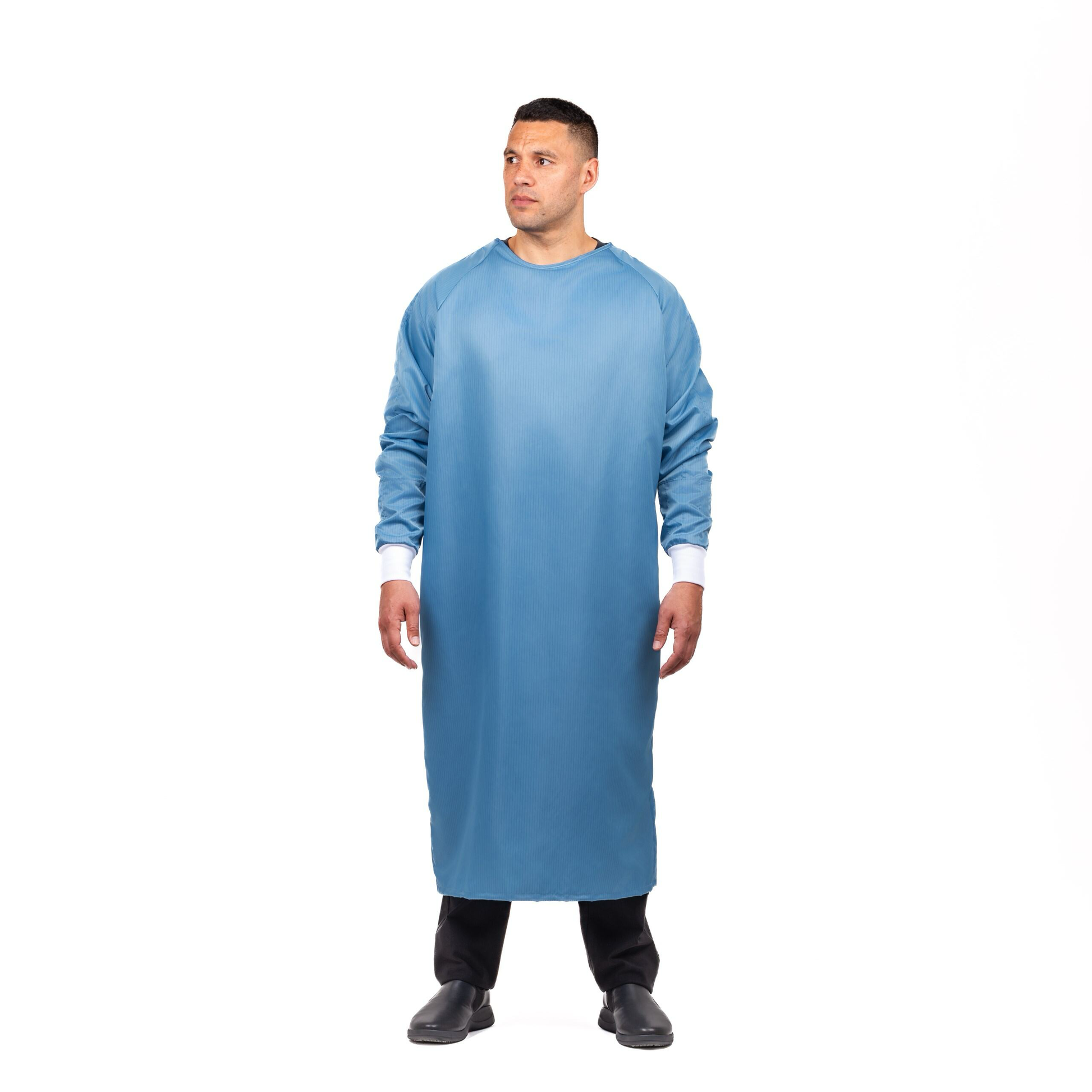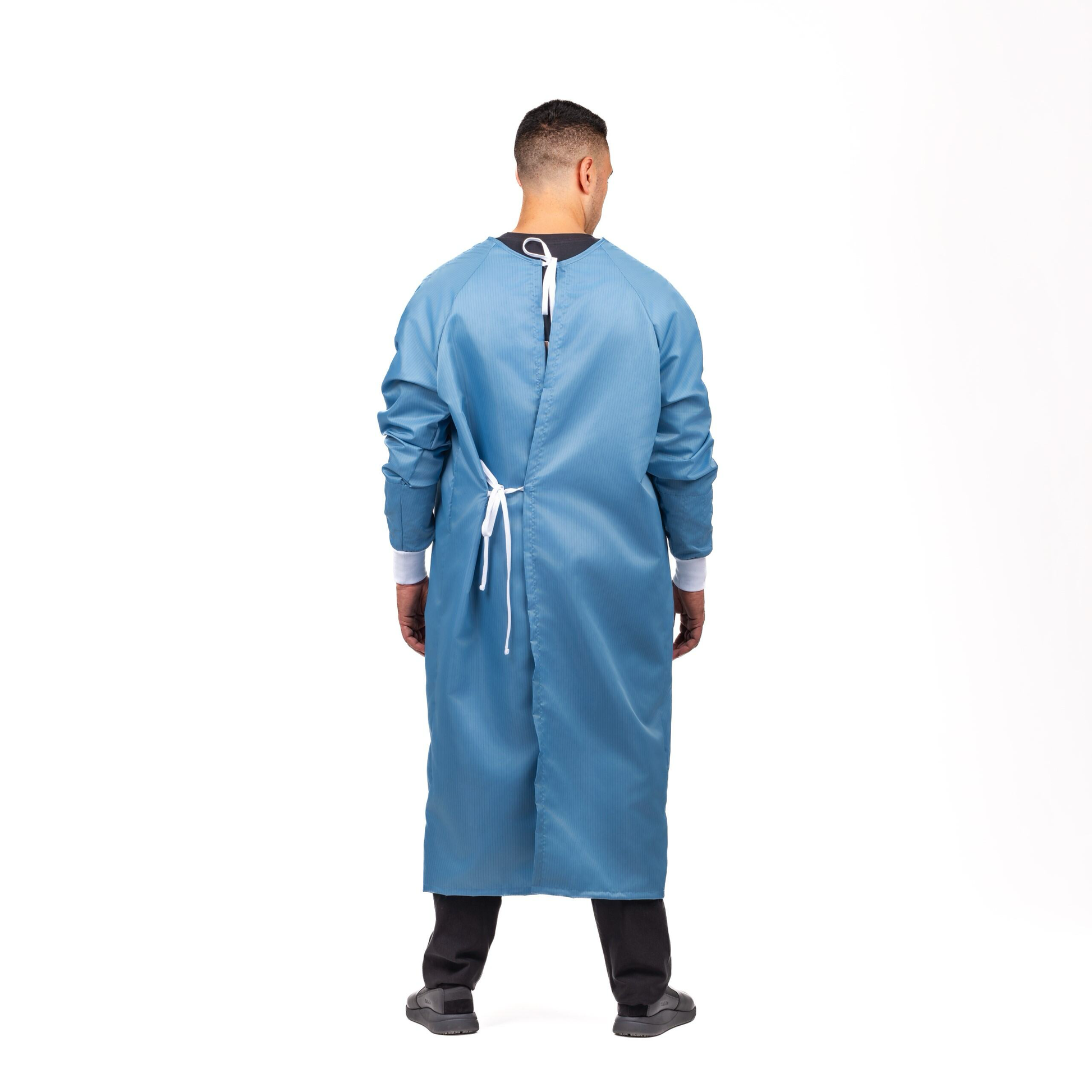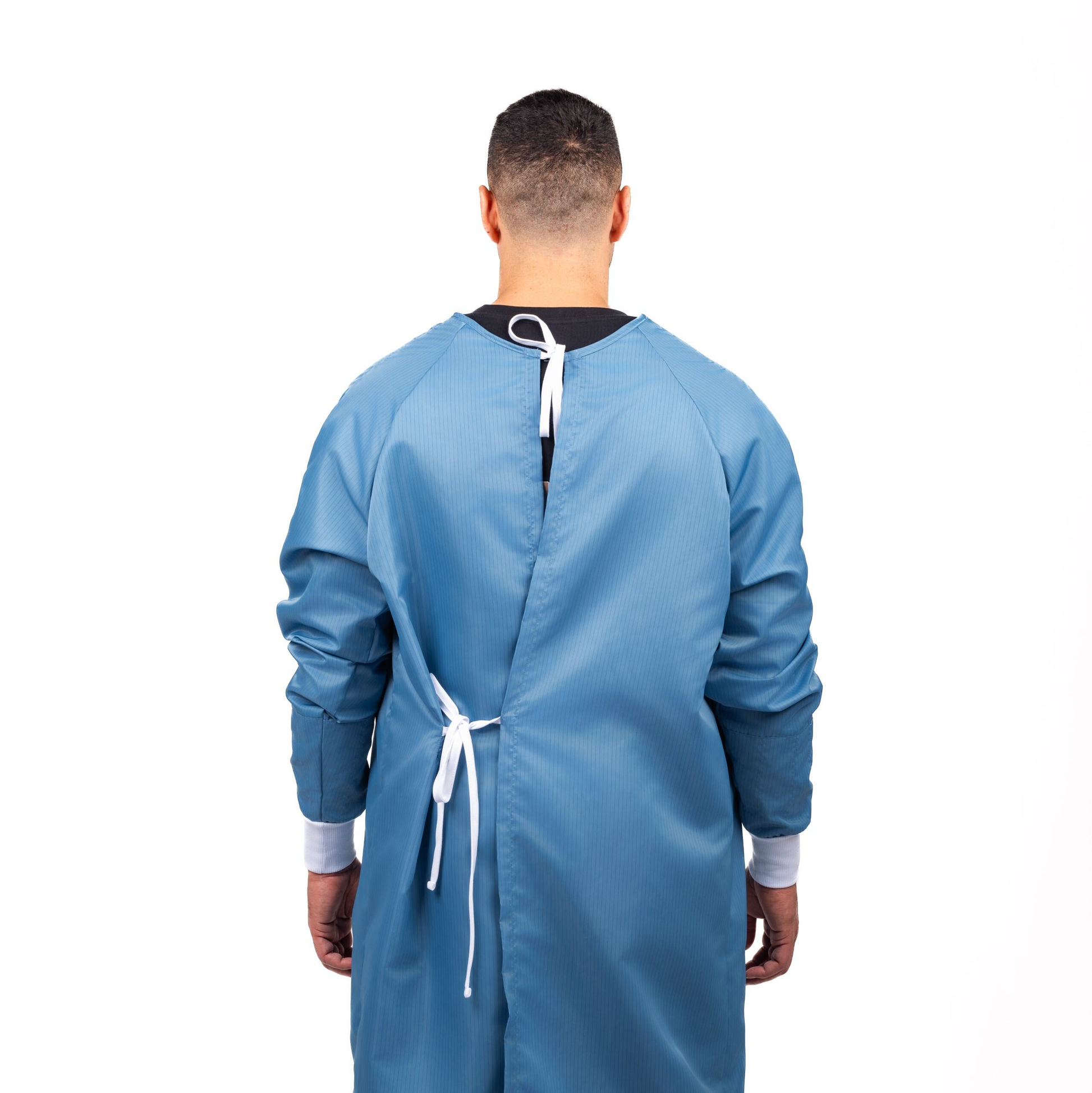 A lightweight long sleeve gown perfect for operational purposes. Offering below the knee coverage with a high round neck, rib cuffs and back ties for a secure fit.