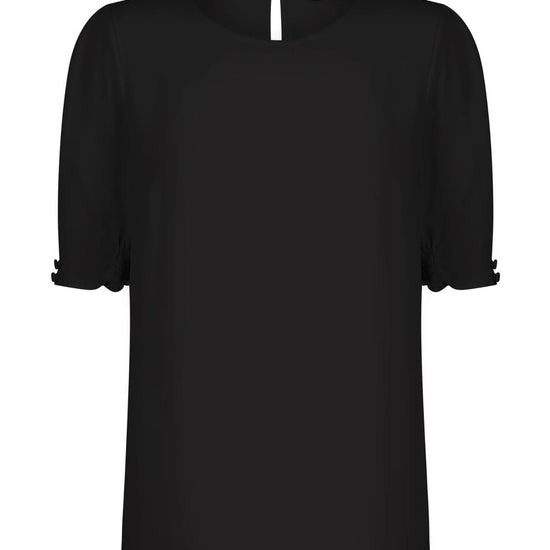 The women's Willow short sleeve button cuff top is fabricated with a soft touch silk handfeel fabric. Mock button cuff with shirring detail is added at the sleeves with a keyhole back neck. This top is machine washable so therefore easy-care, the perfect everyday garment.