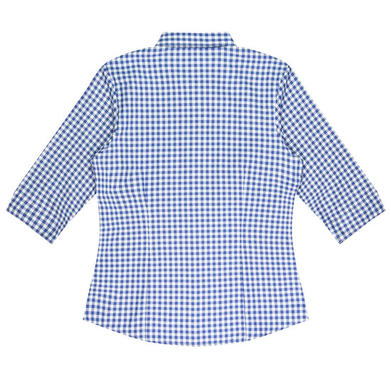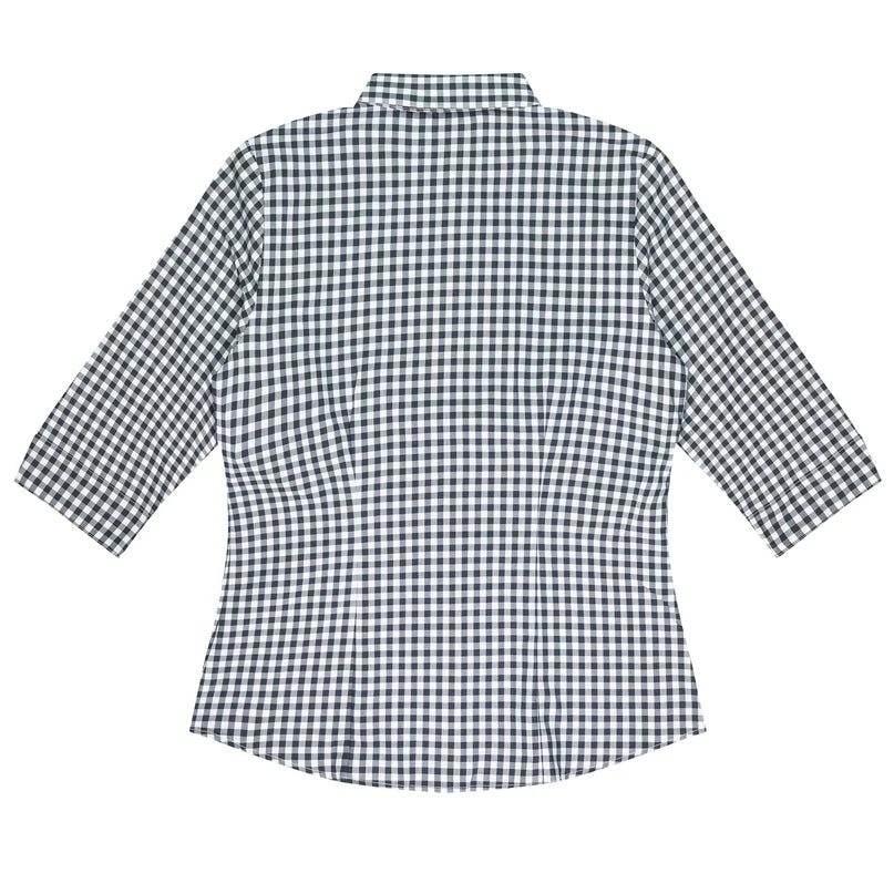 Ladies checked shirt in cotton rich fabric. 3/4 length sleeve features an inverted V. Magic button on inside placket to prevent shirts from gaping at the bust. Small subtle houndstooth check inside the collar. Easy care fabric, anti-pill treatment. 65% cotton 35% polyester.