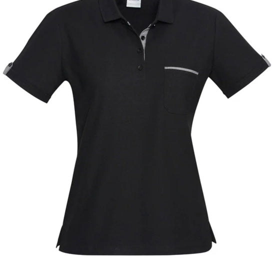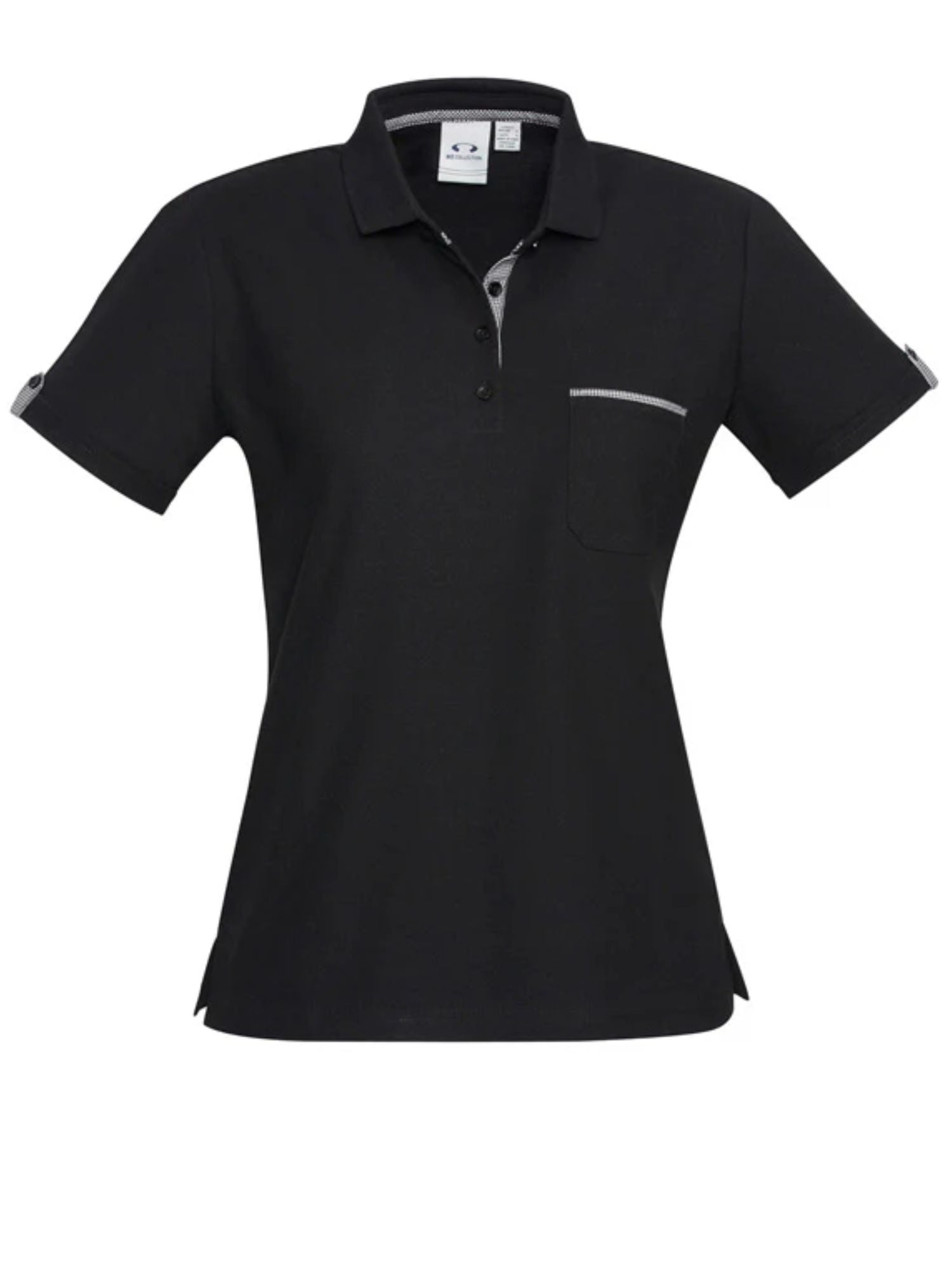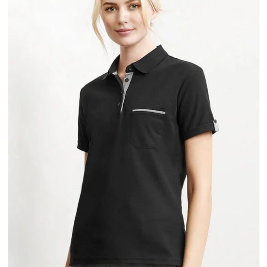 A classic black polo with a twist. The addition of black and white woven check fabric trims and a functioning chest pocket creates a smart, dressed up appearance.