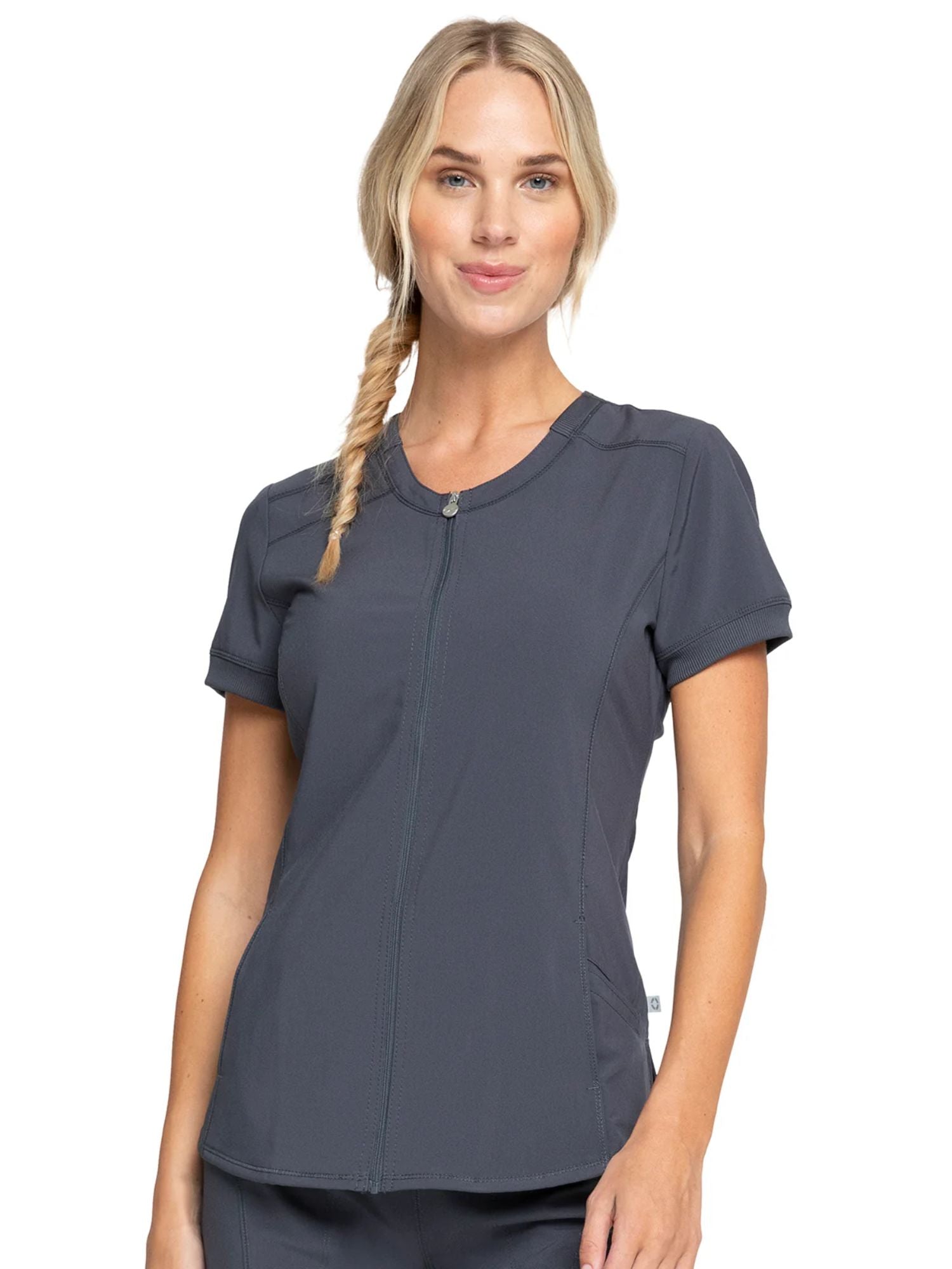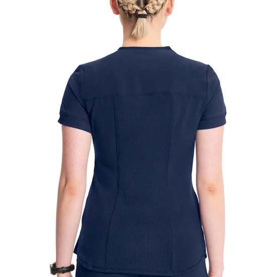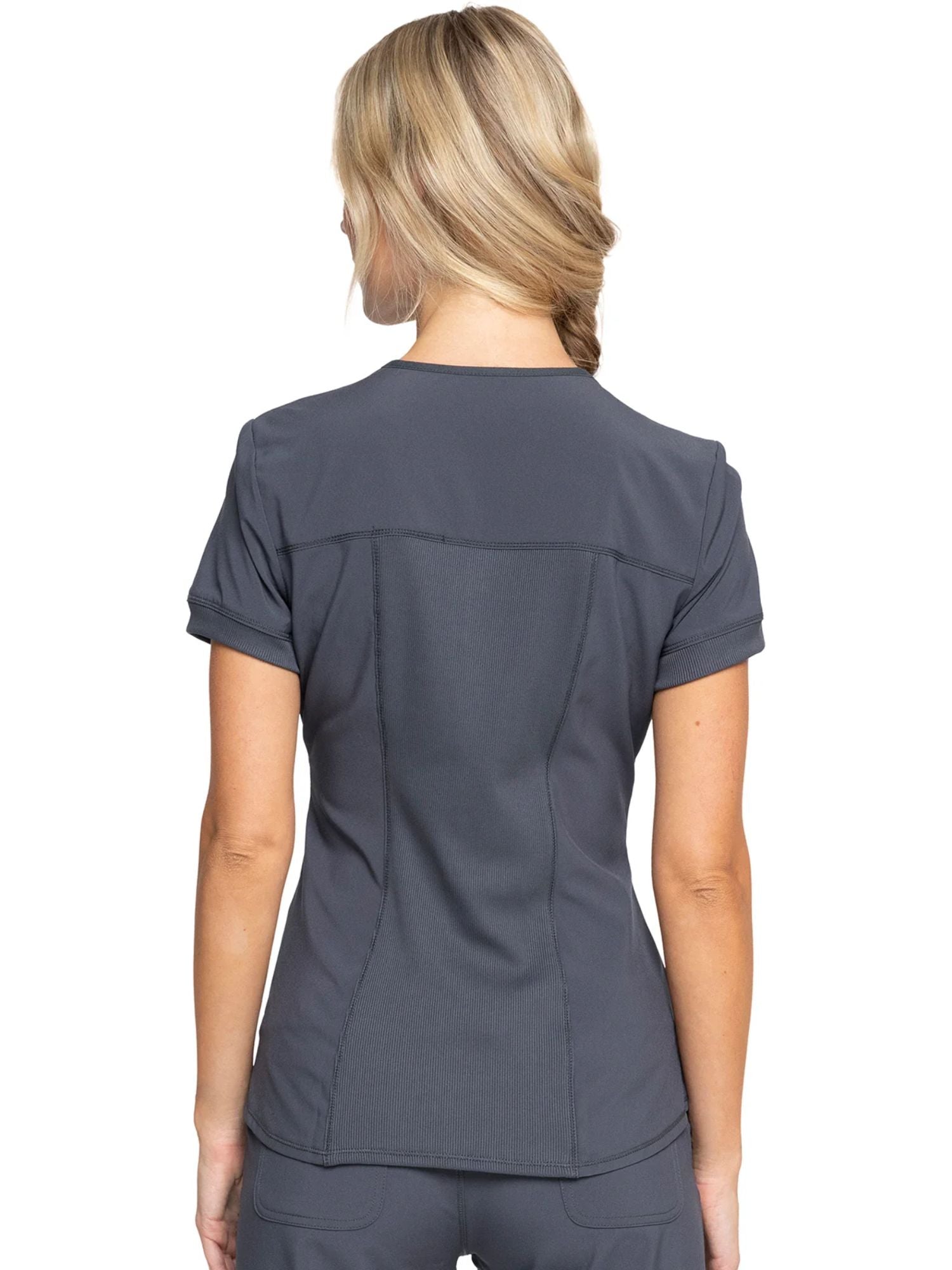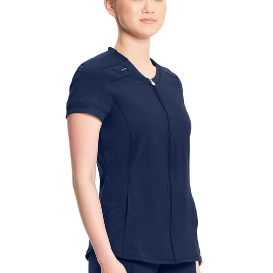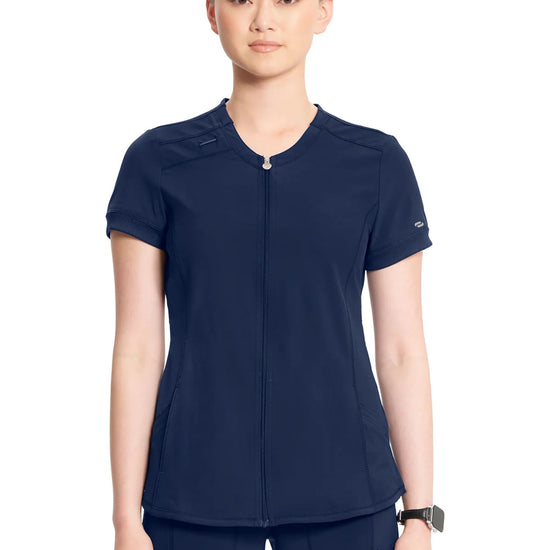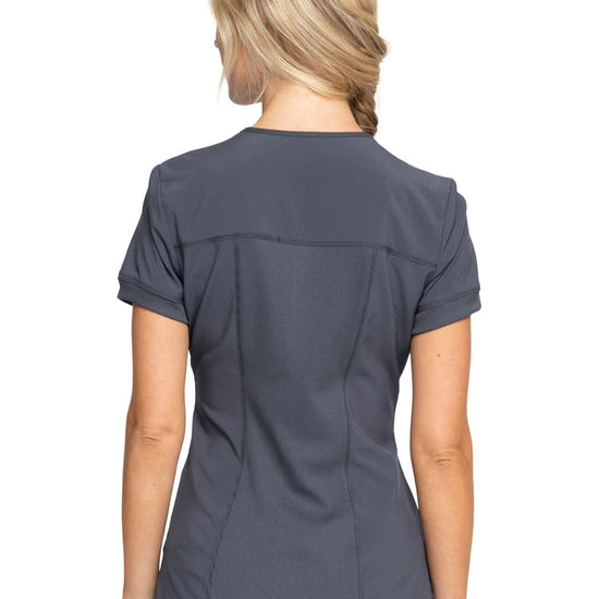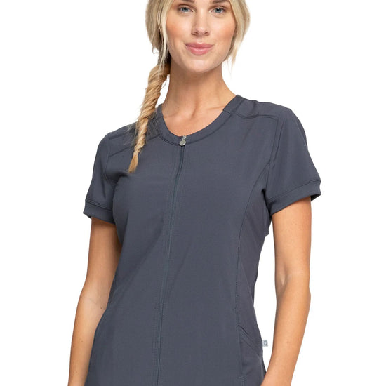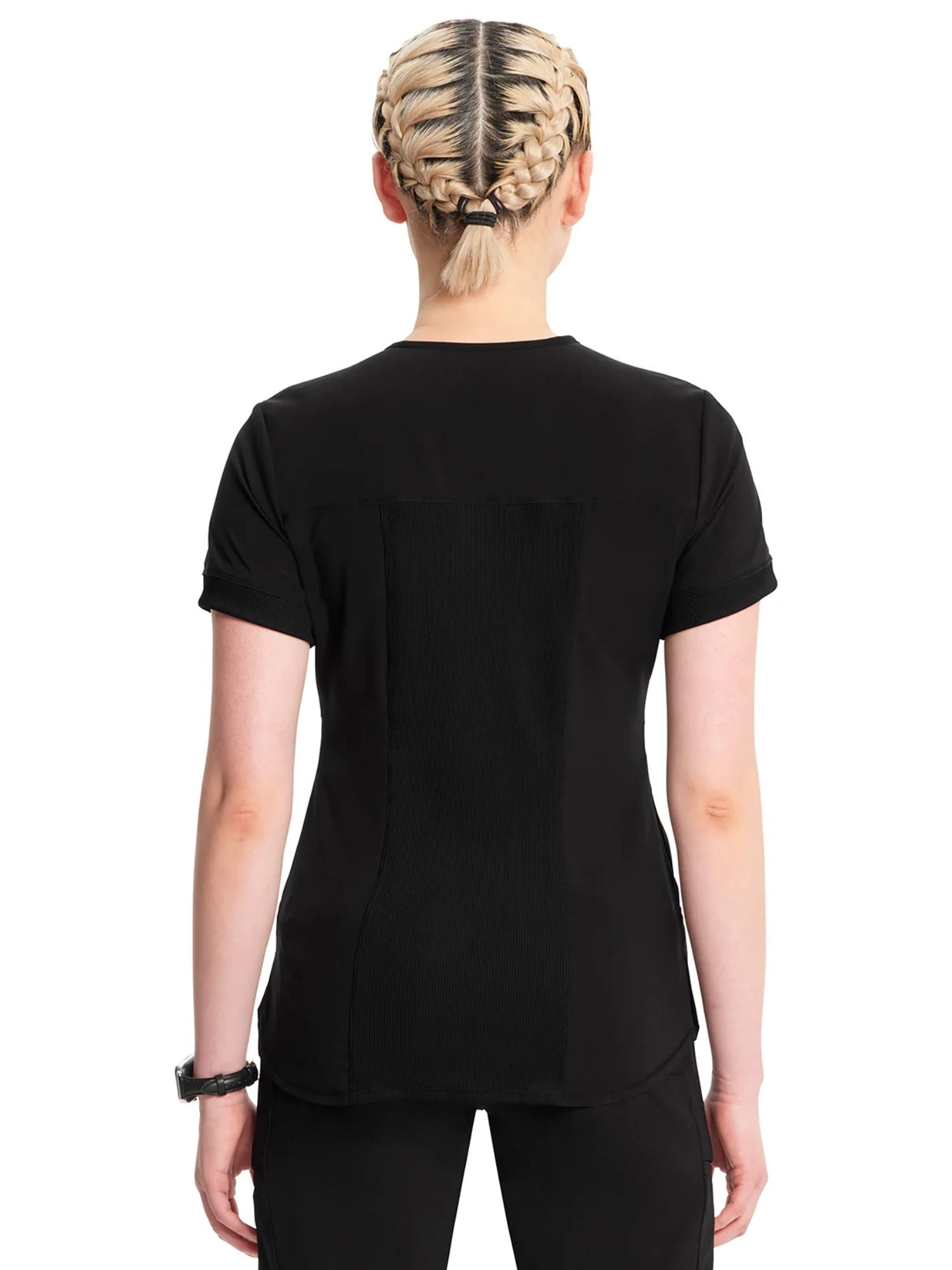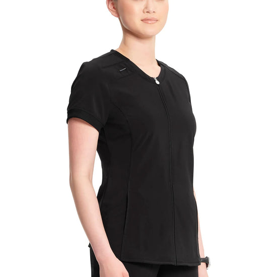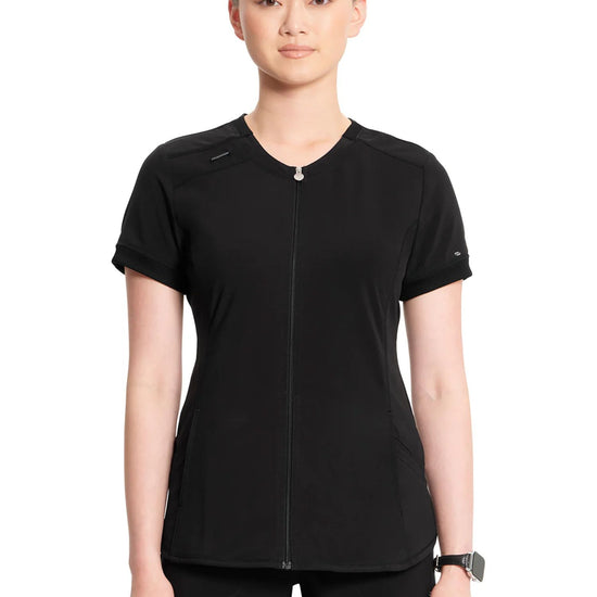 Add a touch of modern polish to your medical wardrobe with this flattering mixed media V-neck top, finished with exposed zip styling for a subtle edge. Touches of rib knit at the neck, cuffs, and center back panel provide comfort and flexibility, in addition to side vents that allow for greater ease of movement.