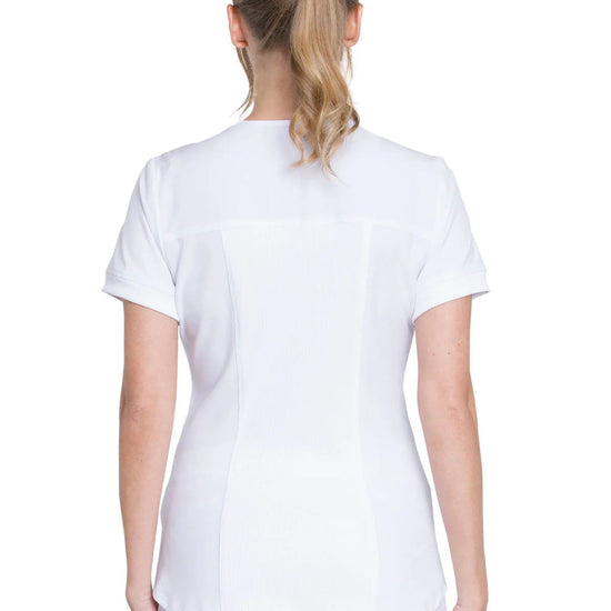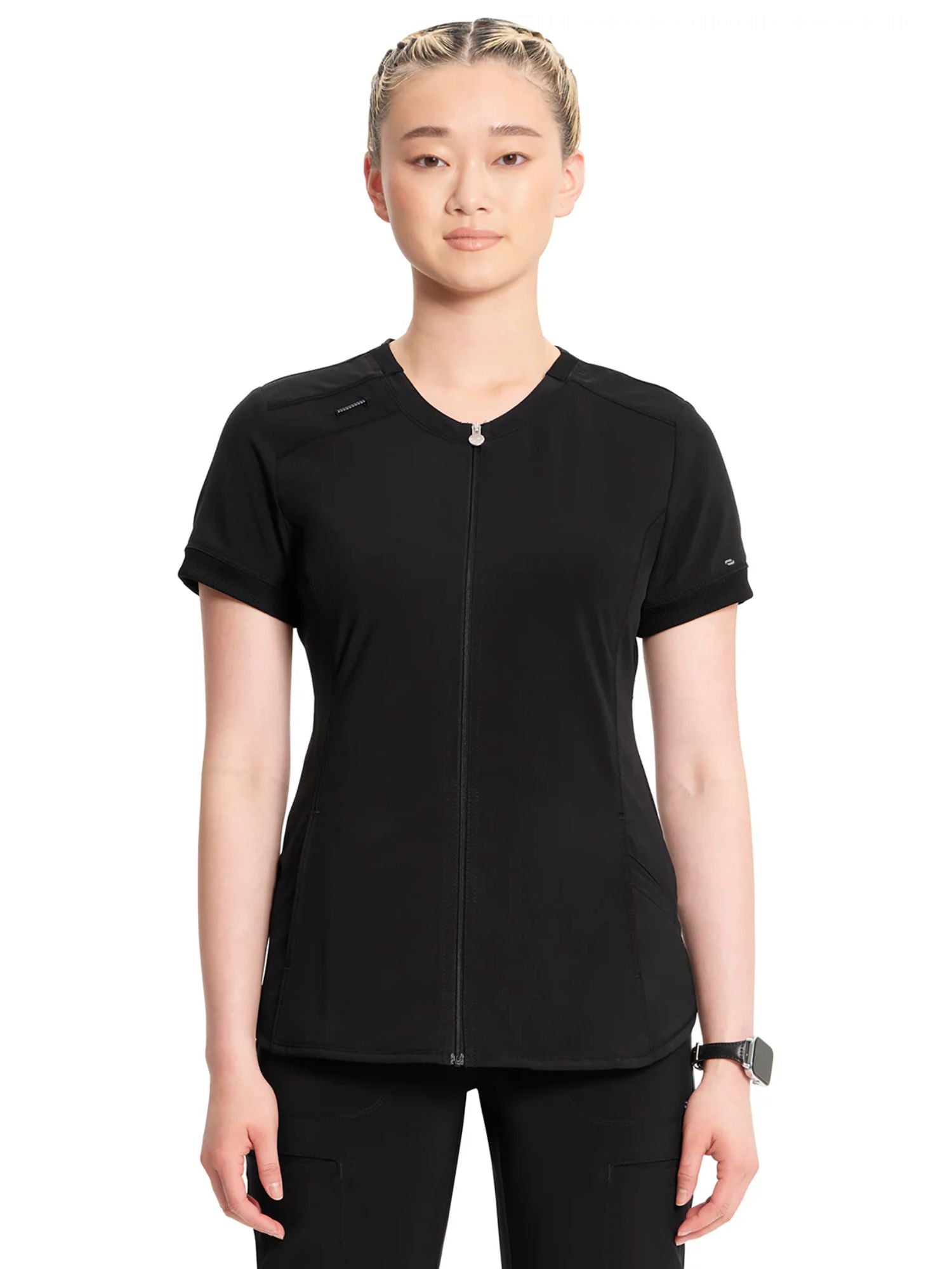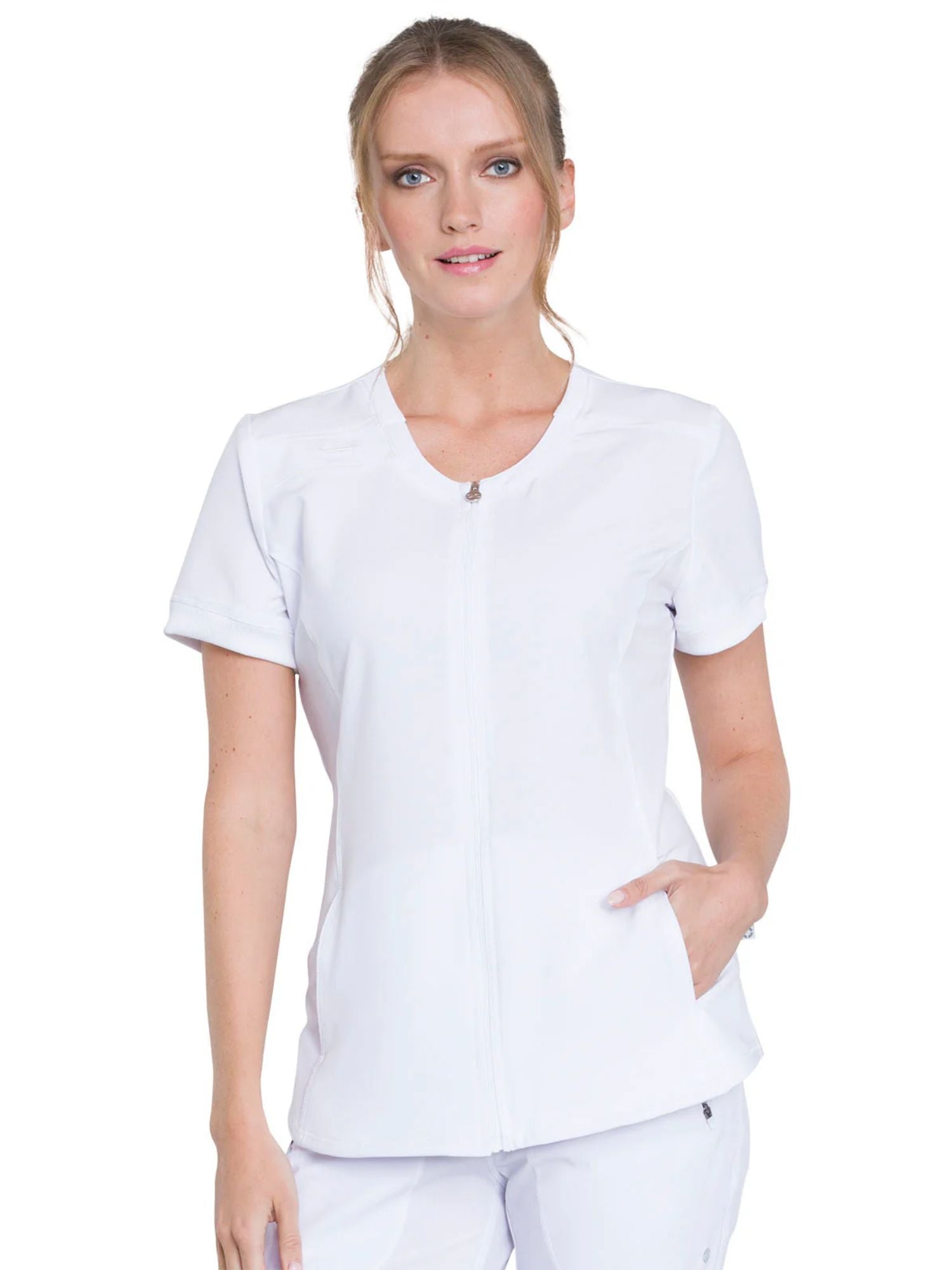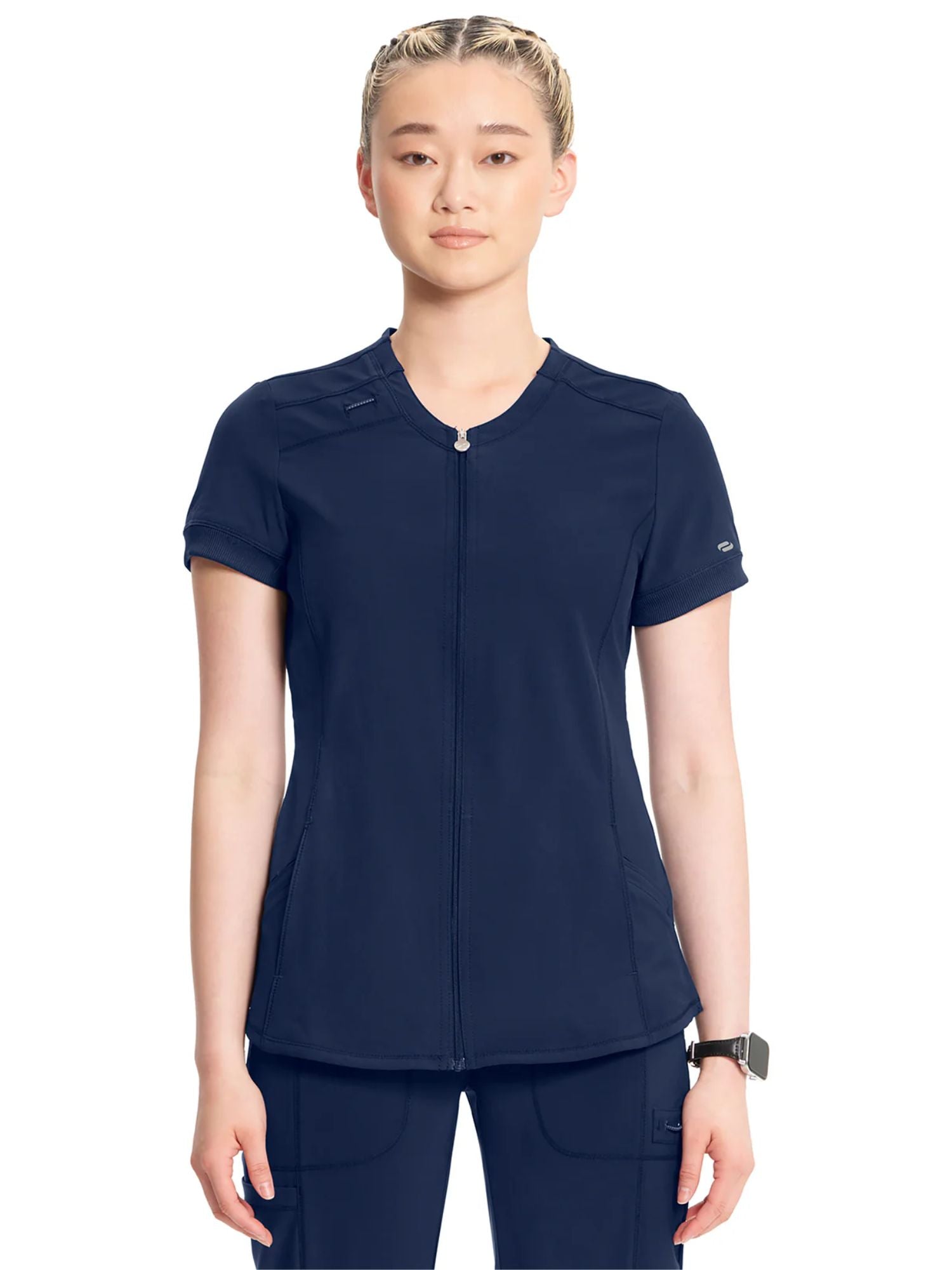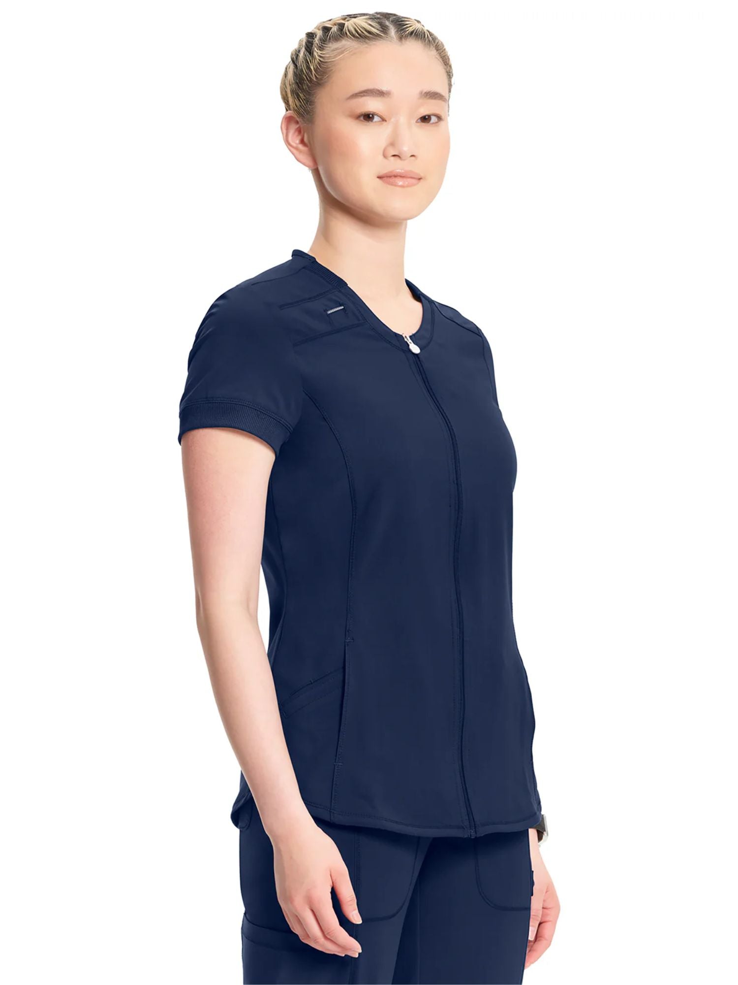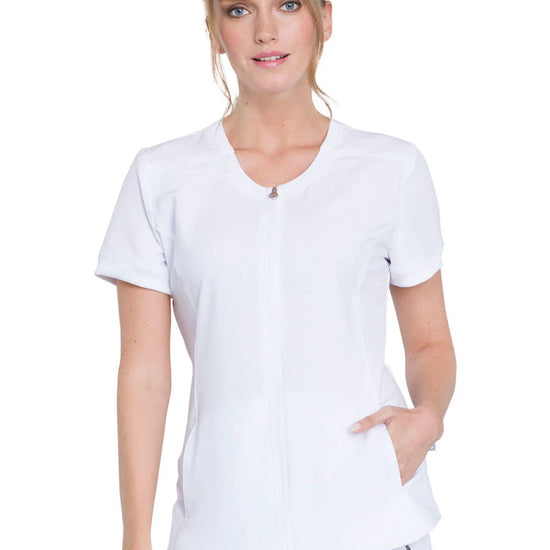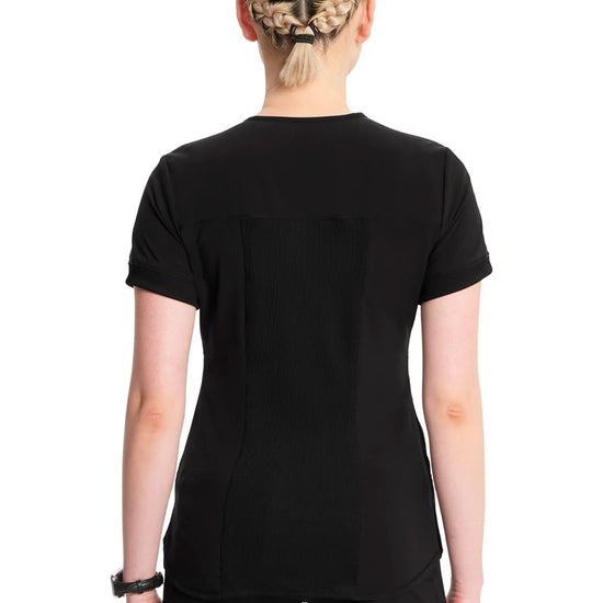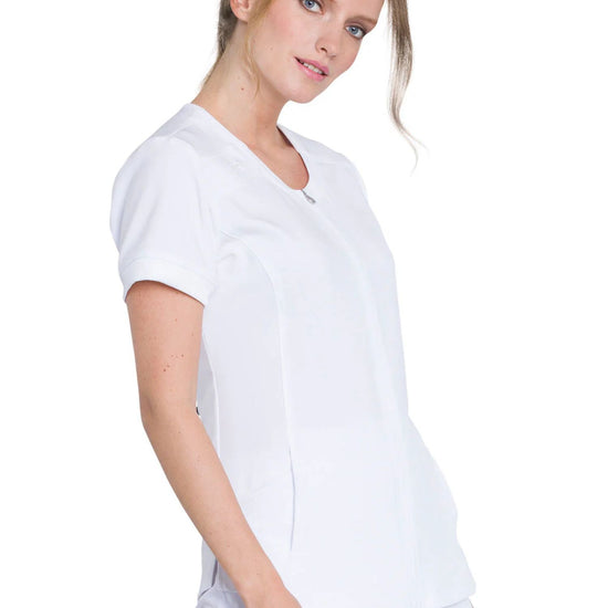 Add a touch of modern polish to your medical wardrobe with this flattering mixed media V-neck top, finished with exposed zip styling for a subtle edge. Touches of rib knit at the neck, cuffs, and center back panel provide comfort and flexibility, in addition to side vents that allow for greater ease of movement.