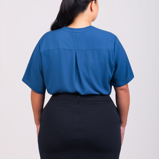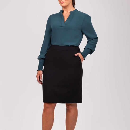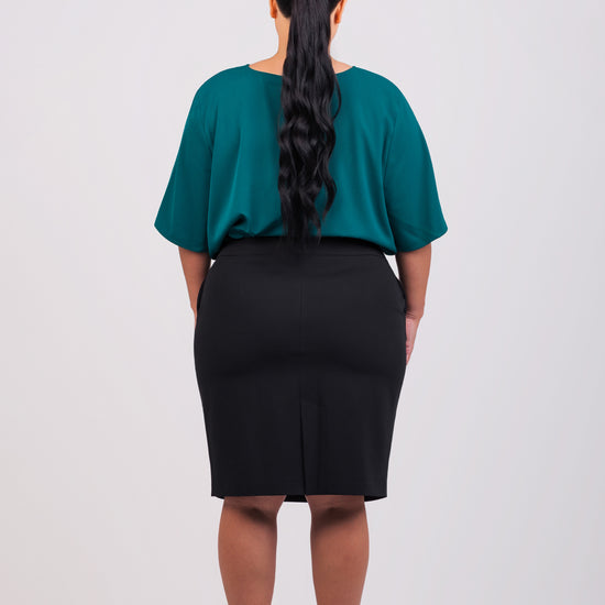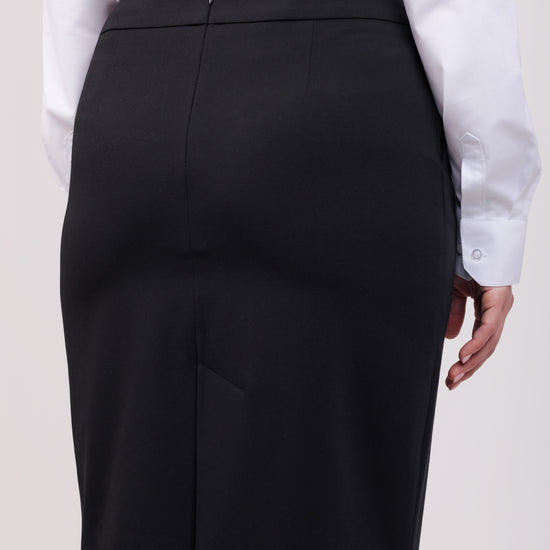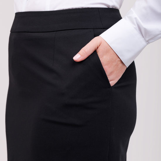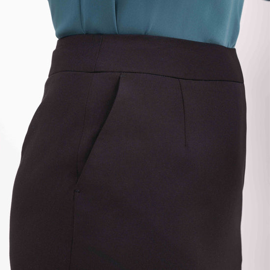 Our Women's Laura Skirt combines style and sustainability. It features a high-waisted design, invisible back zipper, side pockets, and a back slit for easy movement. Front and back darts create a flattering shape. Made from 62% recycled polyester, 32% viscose, and 6% spandex, this Teflon-treated fabric is durable, comfortable, and eco-friendly, using recycled plastic bottles.