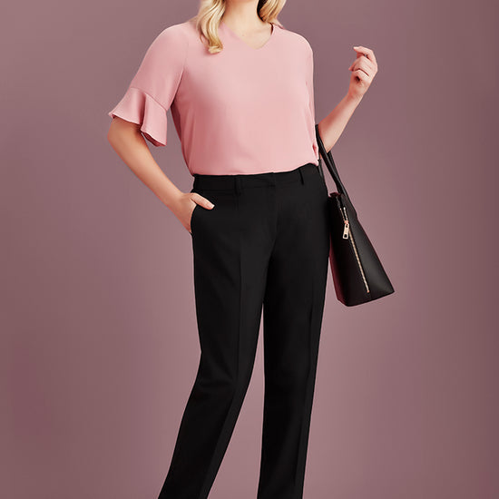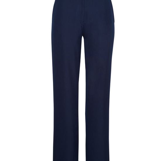 The womens adjustable waist straight leg pant is a best seller and must have for your working wardrobe. It features a hidden elastic waist, deep pockets, belt loops and streamlined leg shape. Its fabricated in a lightweight, breathable easy care fabric that is durable and soft, suitable for both functional and corporate roles.