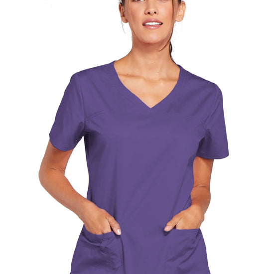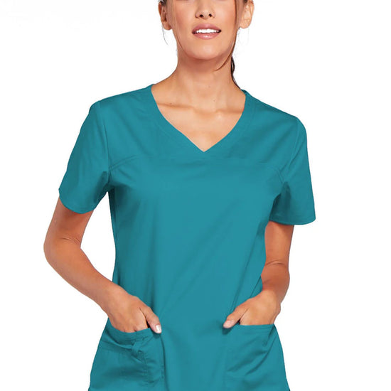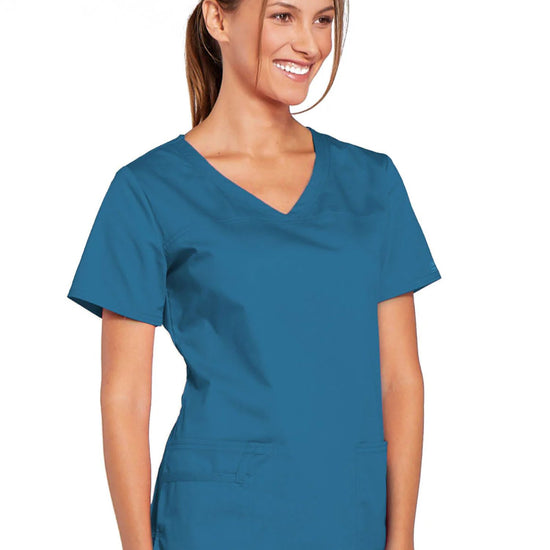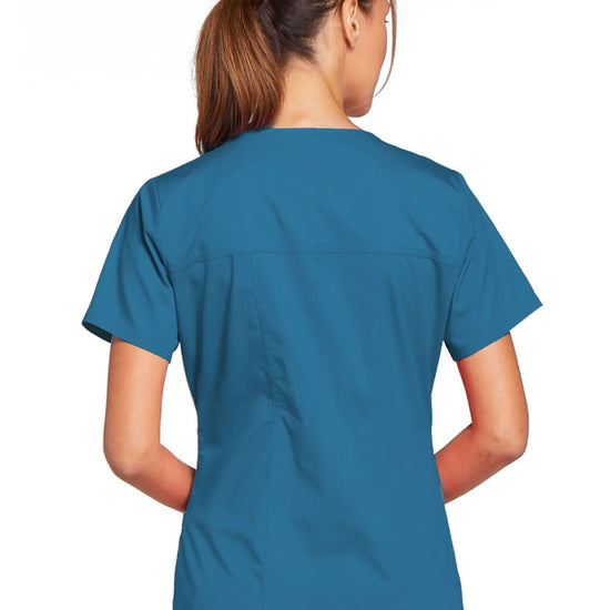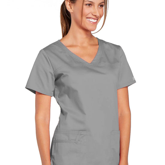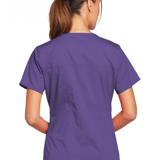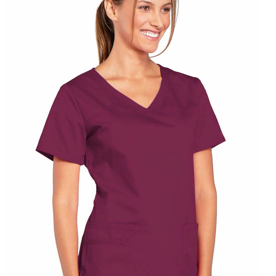 A Modern Classic fit V-neck top features crossover front yokes and patch pockets. The right side pocket has a sectional pocket and I.D. loop. A back yoke, back princess seams and side vents complete the picture. Center back length: 27".