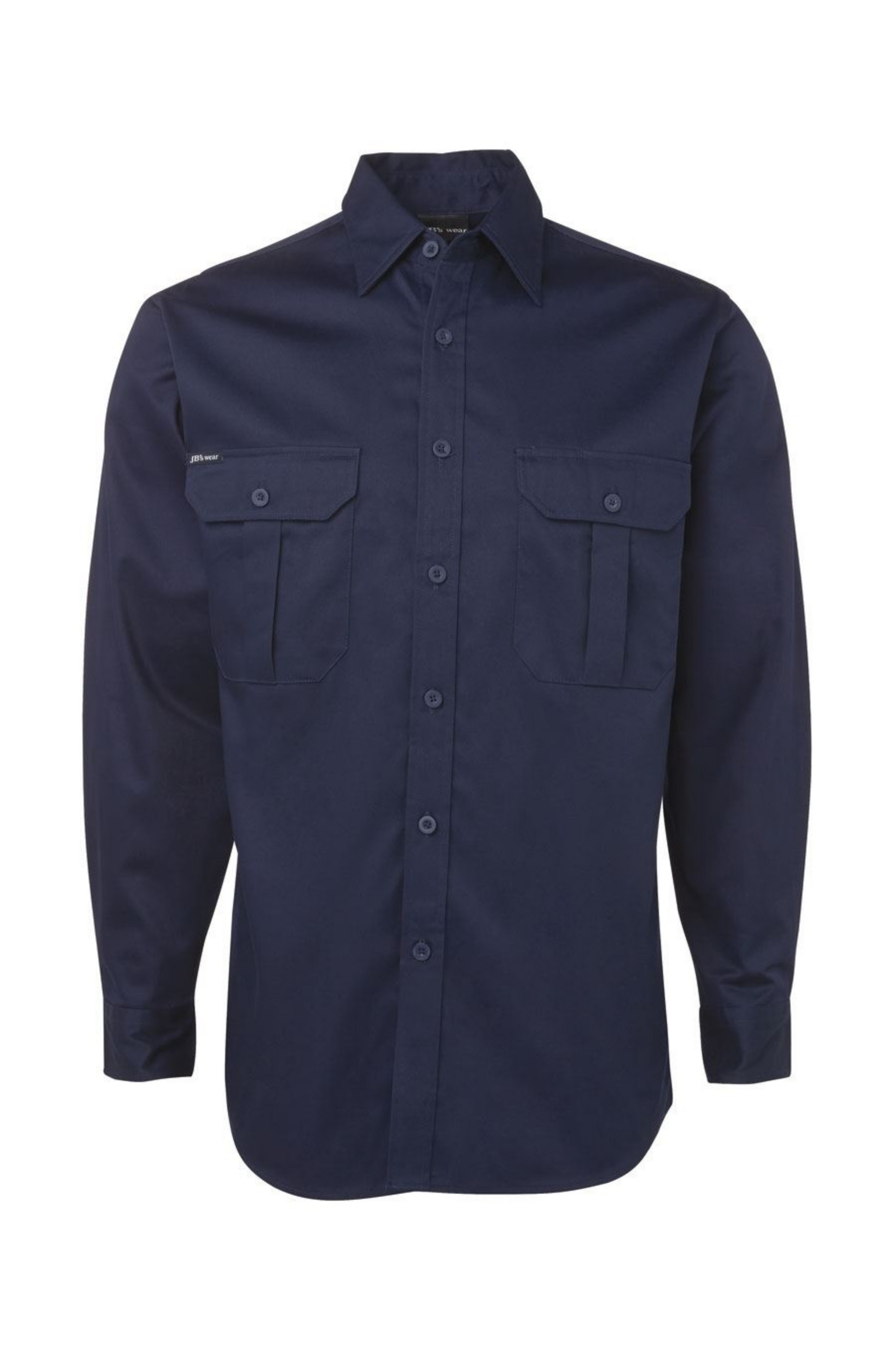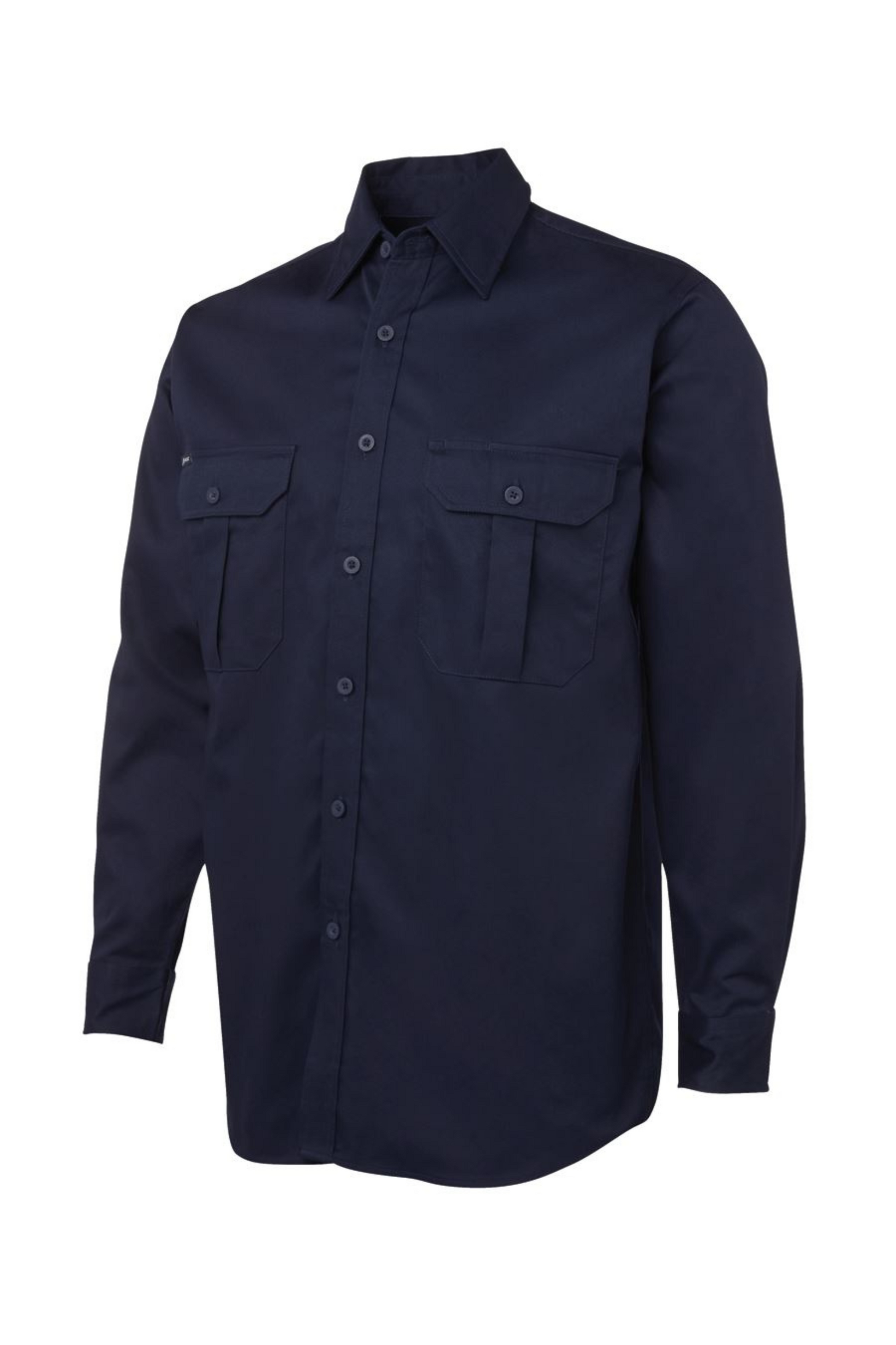 Mens traditional work shirt with button front and double front pockets with button down flaps. Available in Long or Short Sleeves. 100% Pre-shrunk cotton. All pressure points bar tacked for extra strength and durability.