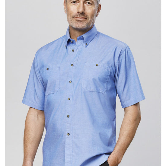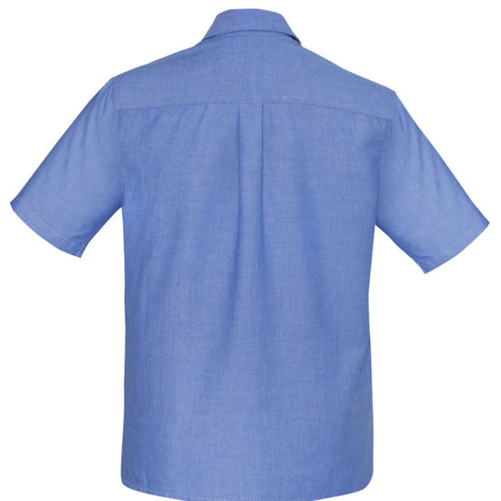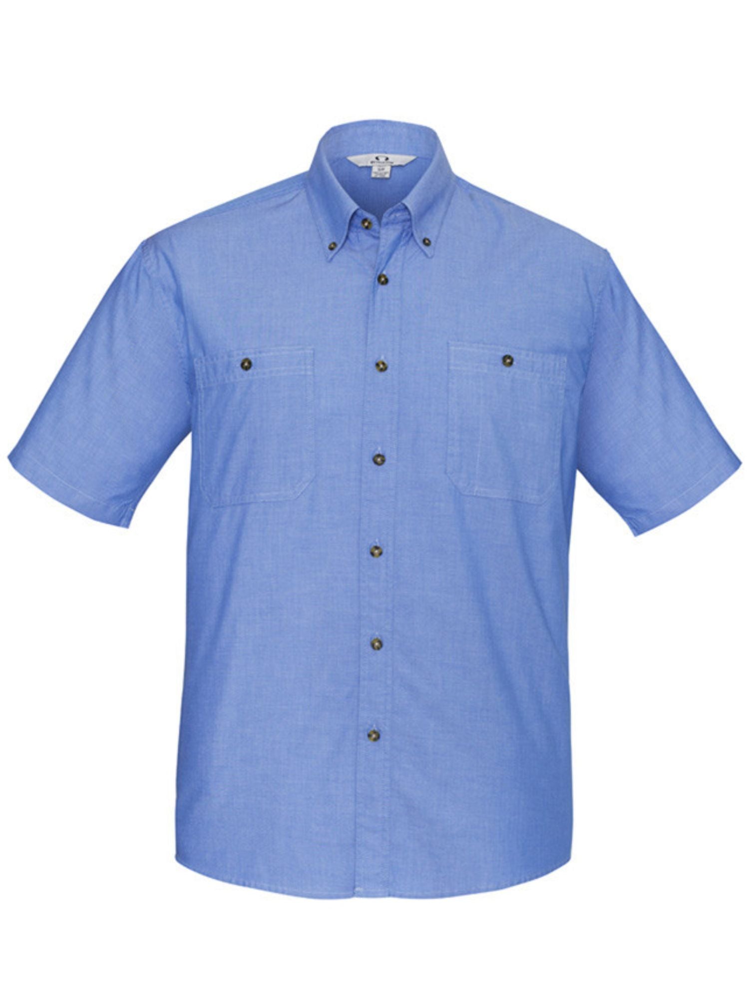 Mens traditional business shirt with double front pockets and button down collar. Black box pleat action back. Short Sleeves. 100% cotton.