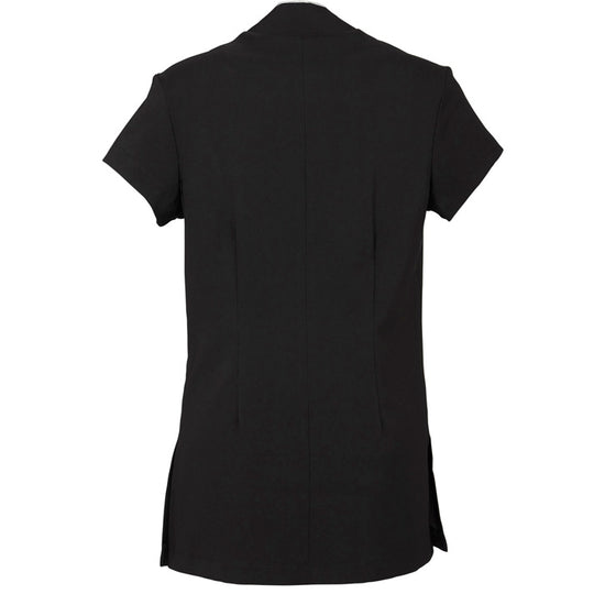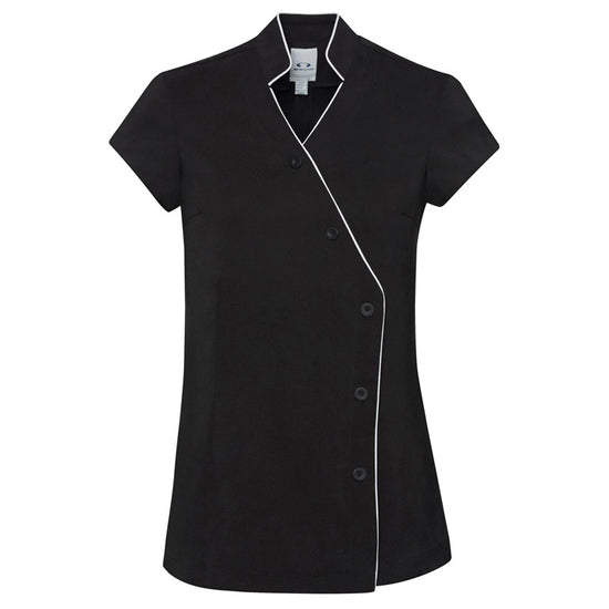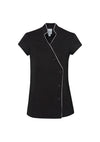 A classic crossover design for the stylish beauty professional! Unique, satin back, 2-way stretch fabric offers superior comfort and keeps you moving freely. Dupont Teflon Coated for superior stain resistance. Modesty panel means no gaping for your staff with this button-through wrap.