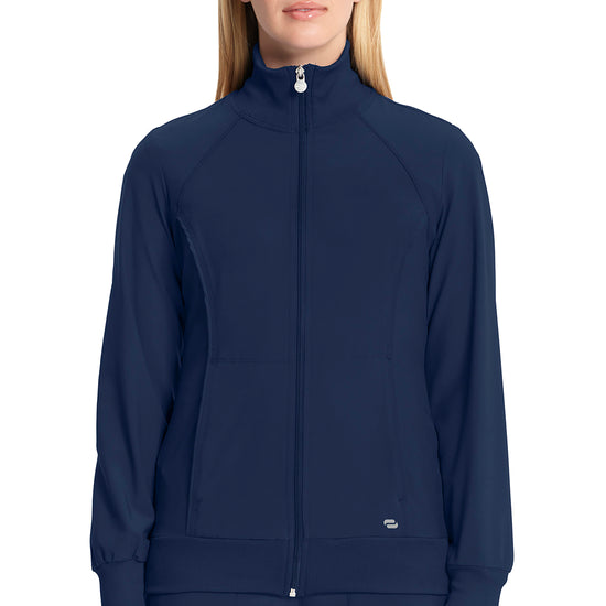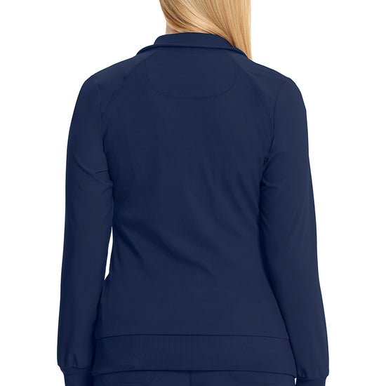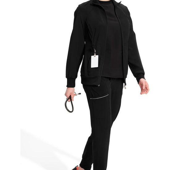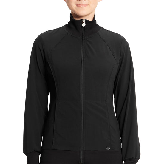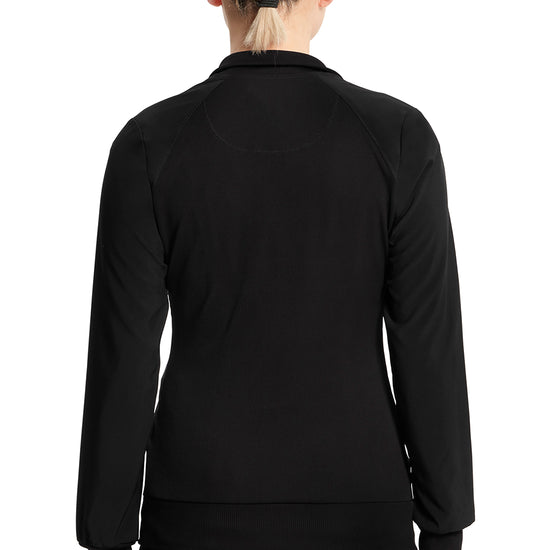 - Back panel, collar, cuffs and waistband in stretch rib knit